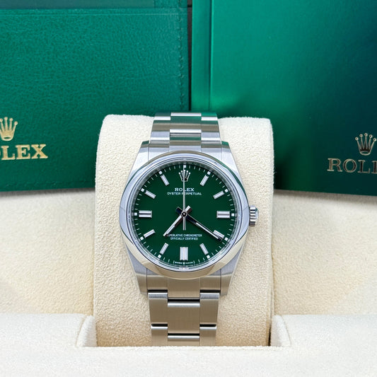 Unworn 2025, Rolex Oyster Perpetual, Oystersteel, 34mm, Pistachio-green dial, Domed Oyster, Ref# 124200-0006, box and papers