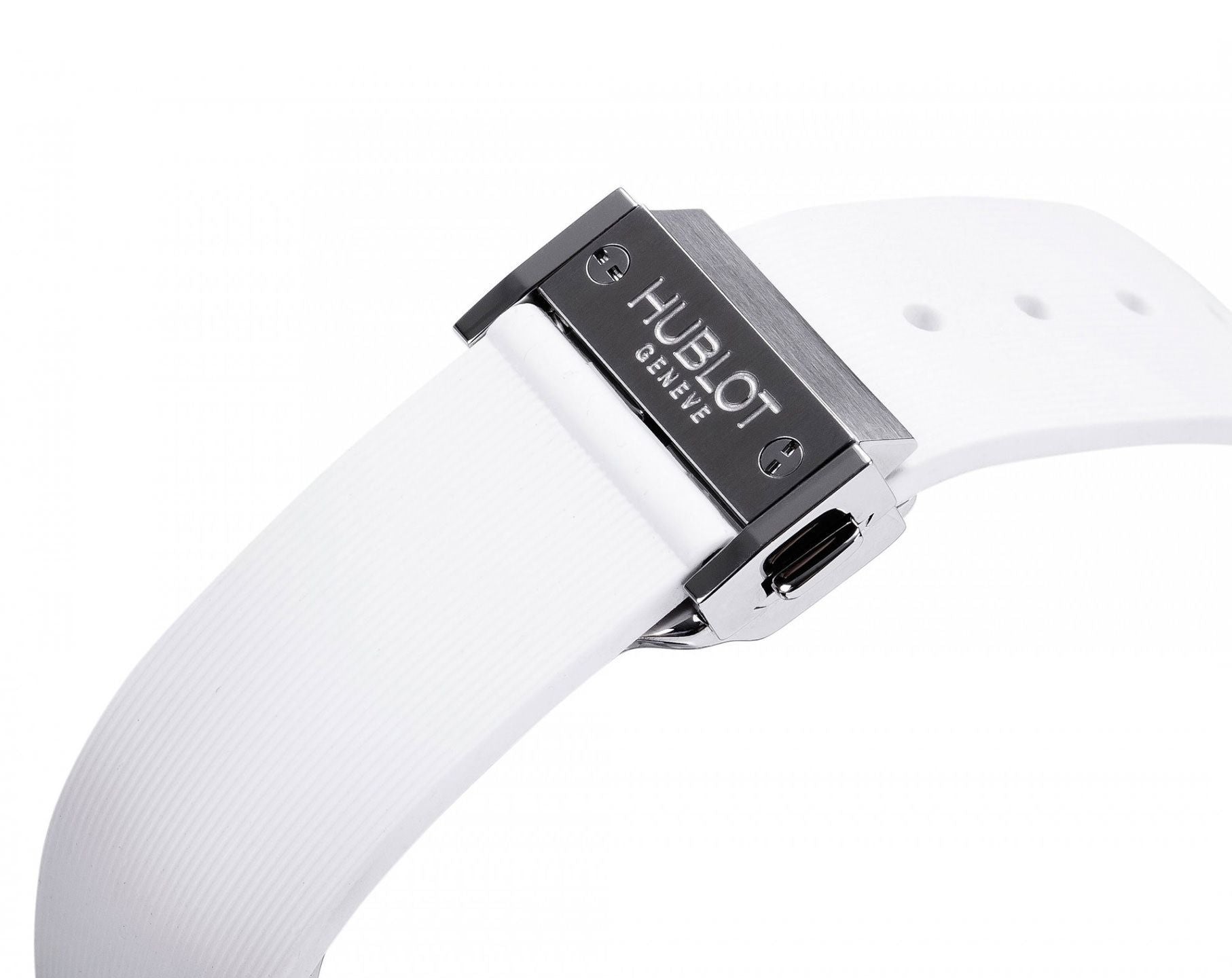 Hublot Big Bang, Steel, White Diamonds, 38mm watch, Stainless Steel case with brushed and polished finishes, Reference 361.SE.2010.RW.1104. Case center (edge) lateral white composite resin inserts. This model has Matte white dial with applied brushed finished stainless steel "applique" style alternating Arabic Numerals and Index hour markers. Brushed finished stainless steel hands with luminous filled tips (minutes and hours hands semi-skeleton). Printed minute track with 5-minute Arabic numerals intervals on the outer perimeter of the dial. Stainless steel Push/pull crown with white rubber center/insert with the Hublot logo. The dial closed by a Scratch-resistant Sapphire Crystal with Anti-reflective Treatment. The watch is equipped fixed Stainless steel bezel set with 126 diamonds weighing +/- 0.87 carats. The watch is Hublot quartz/battery powered Caliber HUB 2900, contains 7 Jewels and has an approximate power reserve of 3-5 years. This model presented on a White Structured Lined Rubber Strap with Stainless Steel Deployant Buckle Clasp. The water resistance is up to 100m/330ft (10 ATM).