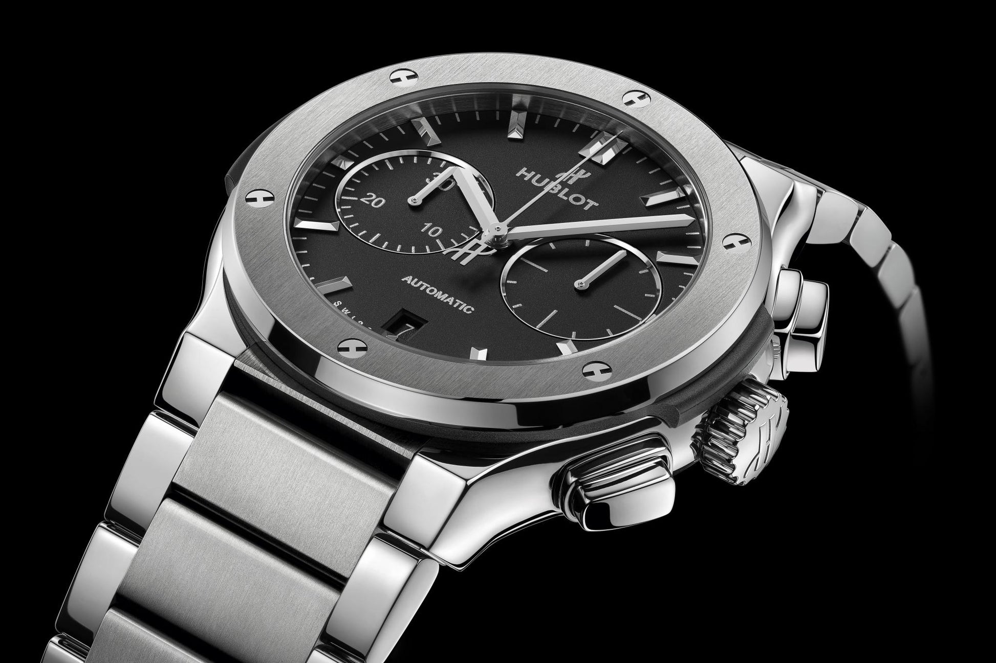 Hublot Classic Fusion Chronograph Automatic 45mm watch, satin-finished and polished titanium case with brushed finished top and bottom center links between the lugs, Reference 520.NX.1170.NX. This model has flat matte black dial with applied brushed finished stainless steel "applique" style index hour markers and polished rhodium plated hands. Minute markers around the outer rim. Small-seconds sub-dial located at the 3 o'clock position. Chronograph/Stopwatch function: large central seconds counter with the "H" logo as a counter-weight; 30-minute sub-dial counter located at the 9 o'clock position. Polished titanium chronograph buttons. Date window located the 6 o'clock positions. Polished titanium crown with Pull / Press function. On it, the Hublot logo engraved on it. The dial closed by a Scratch-resistant Sapphire Crystal with Anti-reflective Treatment. Of Sapphire Crystal made transparent case back. The watch is equipped fixed titanium bezel with a brushed finished top and polished finished beveled edge, secured with 6 polished "H" style titanium screws. Black composite resin "bezel lug" sandwiched between the bezel and case. The watch is self-winding mechanical Hublot Caliber HUB1143, contains 59 Jewels and has an approximate power reserve of 42 hours. This model presented on a satin-finished and polished titanium bracelet with polished outer links and brushed finished center links with titanium Deployant Buckle Clasp. The water resistance is up to 50m/150ft (5 ATM).
