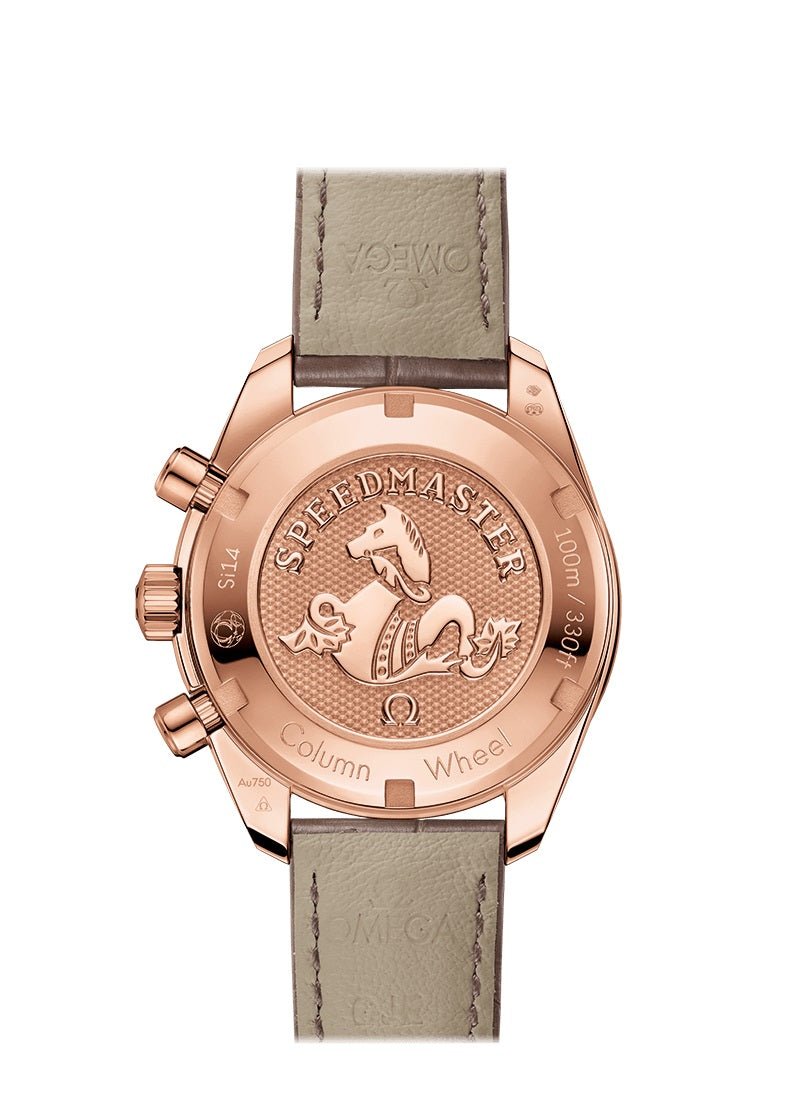 Unworn Omega Speedmaster CO‑AXIAL CHRONOMETER CHRONOGRAPH 324.68.38.50.02.003. 38 mm, Silver dial, Sedna™ Gold case, Sedna™ Gold bezel, 3330 calibre, Automatic Movement, 52 hour power reserve, Leather strap Foldover clasp. Water resistant to 100 m.