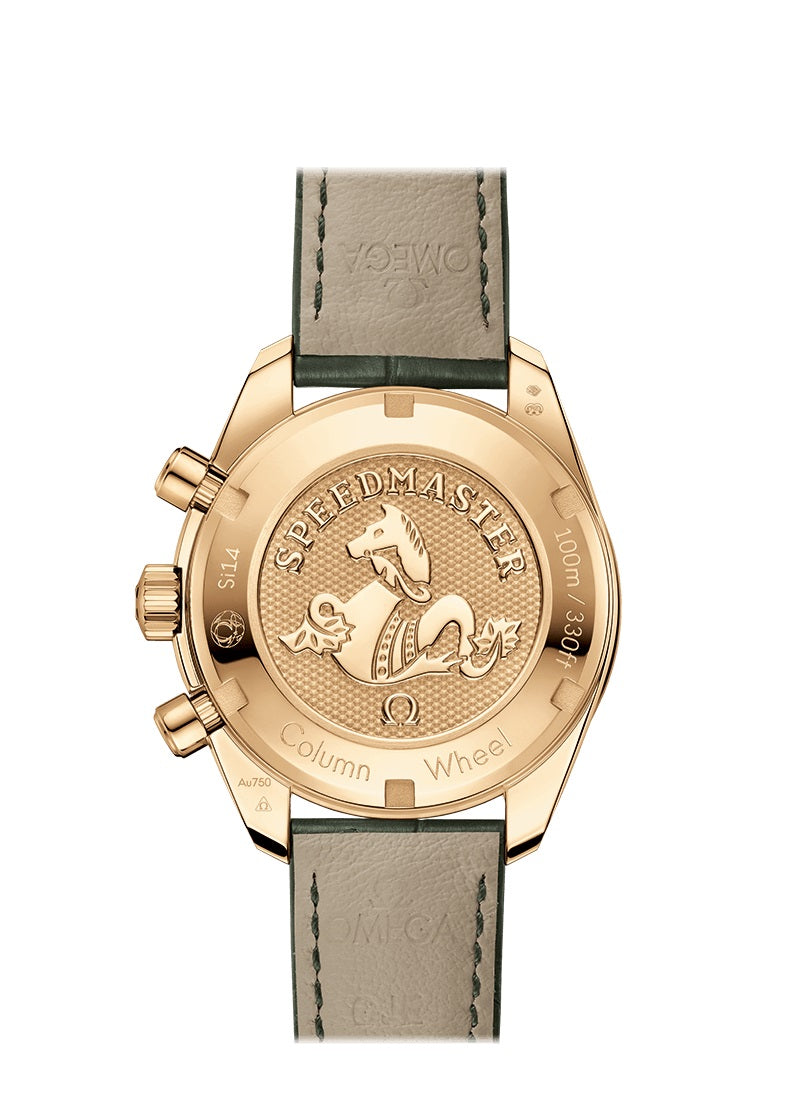 Unworn Omega Speedmaster CO‑AXIAL CHRONOMETER CHRONOGRAPH 324.68.38.50.02.004. 38 mm, Silver dial, Yellow gold case, Yellow gold bezel, 3330 calibre, Automatic Movement, 52 hour power reserve, Leather strap Foldover clasp. Water resistant to 100 m.