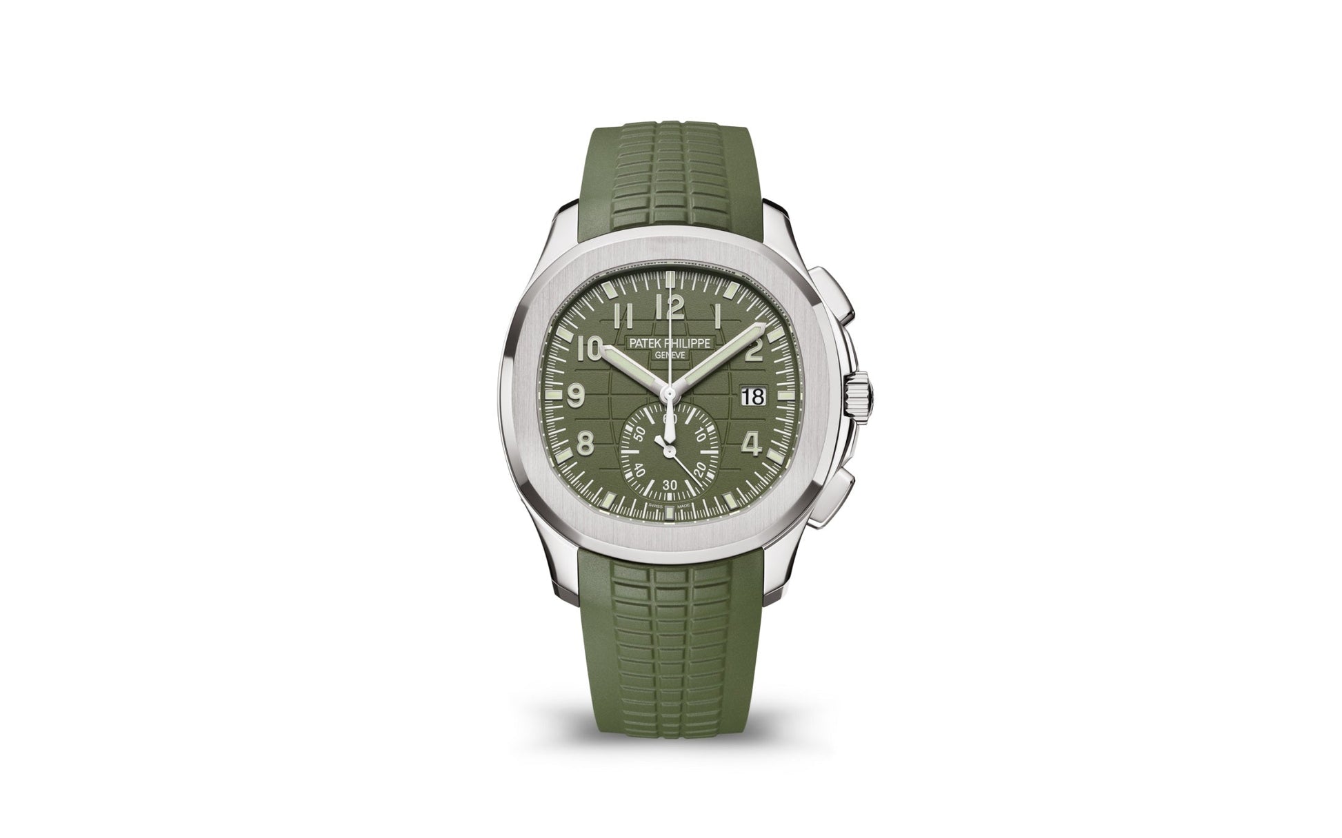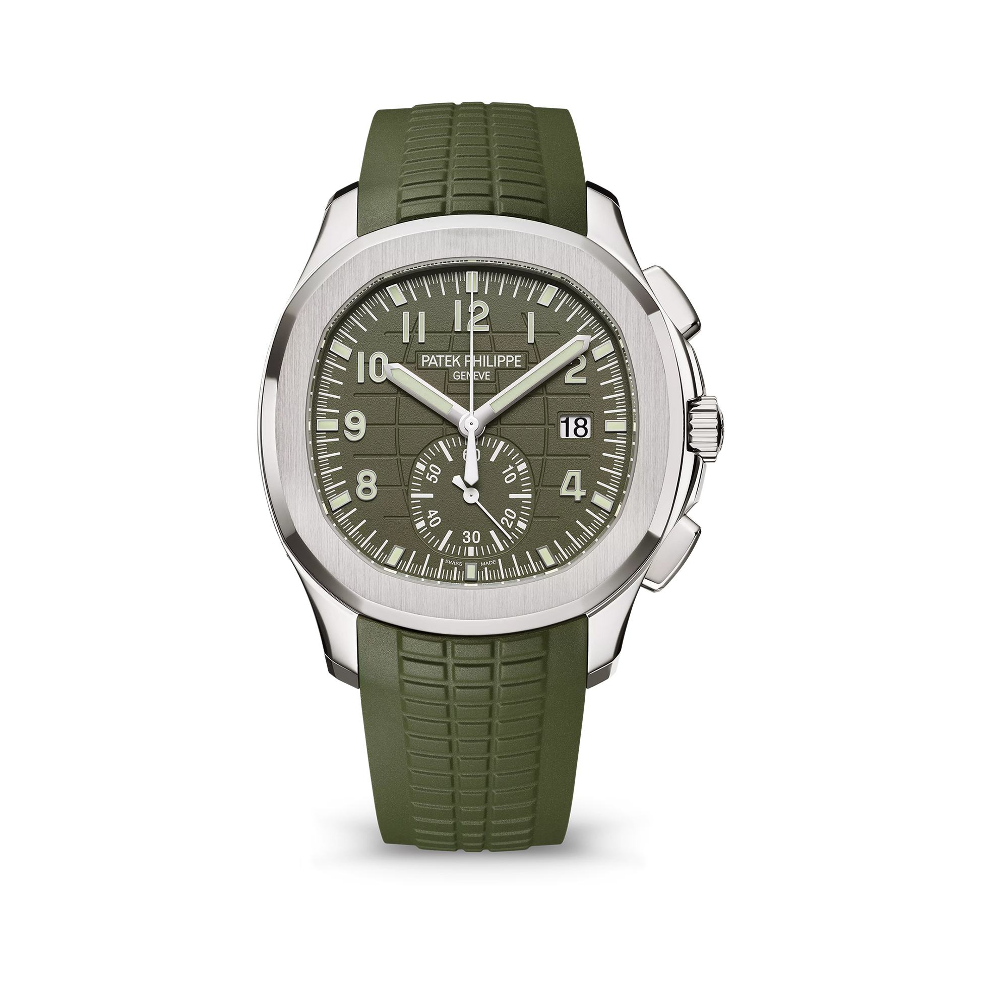 New Patek Philippe Aquanaut Chronograph luxury sports watch, 42,2mm, 18k White Gold, Ref. 5968G-010. The first chronograph with a flyback function in the modern Aquanaut sports collection, which perfectly matches the character of this young and dynamic watch line. His 18k White Gold rounded, pillow-like octagon-shaped case and gently curved ears are unmistakable. On a beautiful Khaki green dial with embossed embossing, perfectly readable large applied polished Arabic numerals made of 18k White Gold with luminescent coating in the form of hour markers look harmoniously. The manufacturer paid special attention to the second track on the outer rim of the dial. She is applied in long and short silvery lines with fairly wide luminous marks located every 5 minutes. Large polished luminous hour and minute hands in 18k White Gold indicate the time. These are complemented by a slim and elegant chronograph second hand (Sweep seconds hand). At the 6 o'clock position, there is a recessed green auxiliary chronograph counter with reverse movement repeating which follows the rounded octagonal shape of the bezel. It has glowing white Arabic numerals, white markers, and a white indicator needle. The date window is traditionally at the 3 o'clock position. Rectangular 18k White Gold buttons located on the right side of the case control the chronograph. At the 8 o’clock, position on the case is an instant date corrector. A polished 18k White Gold screw-down crown with a ribbed edge for a comfortable grip and the Patek Philippe logo is the finishing touch to the perfect picture. The dial is covered with a scratch-resistant sapphire crystal. The screw-down case back is also made of sapphire crystal, which allows you to see the magical work of the movement. Against this backdrop, a flat, fixed bezel in 18k White Gold, vertically ground on the front and polished on the sides, provides a wide view of the dial. The finish on the side of the bezel is amazing because at first glance, it looks rounded, but upon closer inspection, you can see the crisp edges playing with the light. The model is equipped with a Patek Philippe caliber CH 28‑520 C with a self-winding mechanical movement containing 32 jewels and a power reserve of min. 45 hours - max. 55 hours. This beautiful sport chic watch is presented on a Khaki green tropical rubber strap. This new composite material is highly resistant to wear, salt water and UV radiation. The strap are fastens with Patek Philippe's patented 18k White Gold folding clasp, polished and engraved with the Calatrava cross. Opening the clasp reveals the engraved Patek Philippe logo with the word GENEVE. Water resistant up to 120m/394ft (12 ATM).
