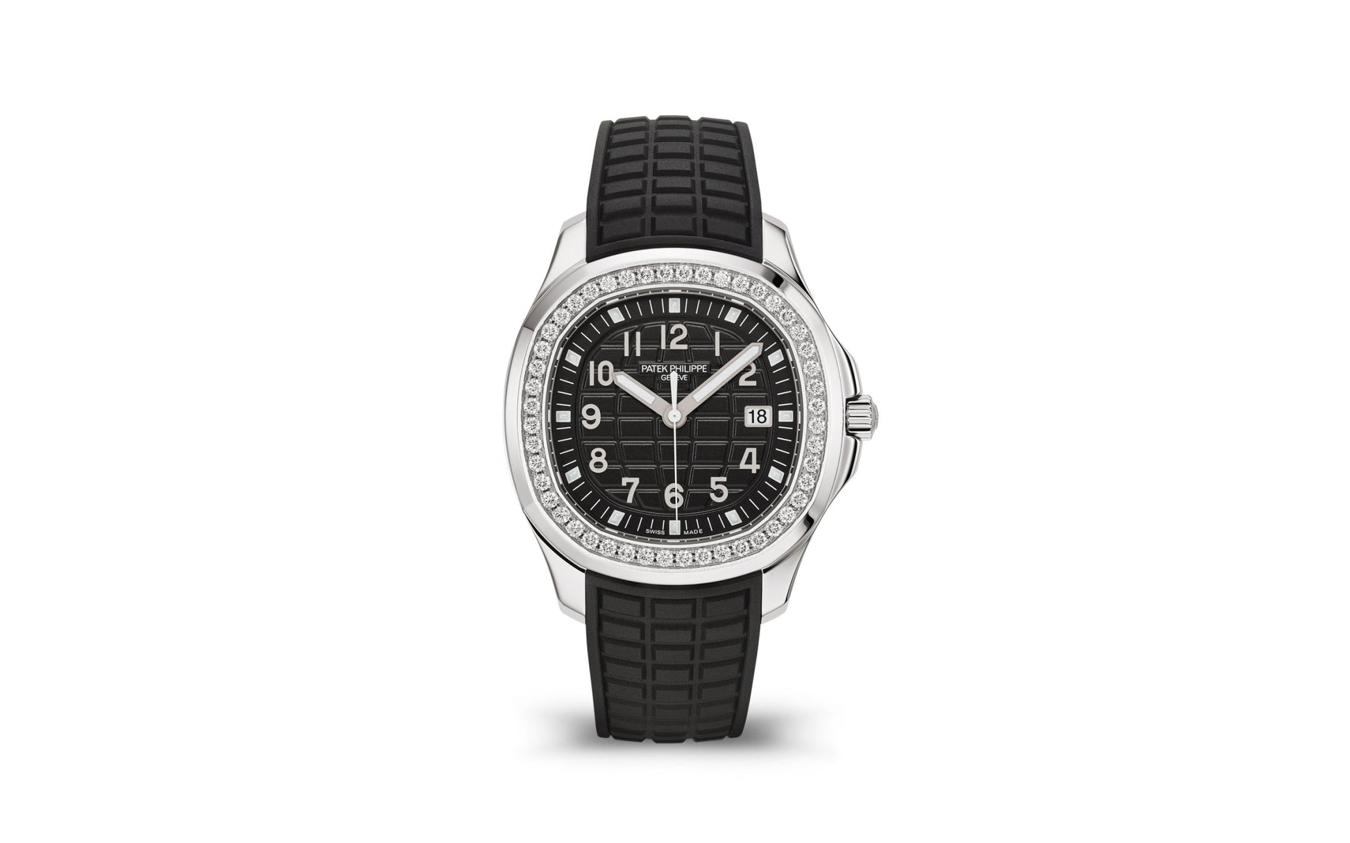 New Patek Philippe Aquanaut Luce luxury Ladies watch, with a larger diameter 38,8mm, Stainless Steel, Ref. 5267/200A-001. The first complex quartz wristwatch in the modern Aquanaut sports collection, which perfectly matches the character of this young and dynamic watch line. His Stainless Steel rounded, pillow-like octagon-shaped case and gently curved lugs, complemented by polished and satin finishes are unmistakable. On a beautiful black dial with embossed "Aquanaut" harmoniously looks perfectly readable large applied polished Arabic numerals made of 18k White Gold with luminescent coating in the form of hour markers. The manufacturer paid special attention to the second track on the outer rim of the dial, on which applied silvery lines with fairly wide luminous marks located every 5 minutes. Large polished luminous hour and minute hands in 18k White Gold indicate the time. These are complemented by a slim and elegant second hand (Sweep seconds hand). The date window is traditionally at the 3 o'clock position. A polished Stainless Steel screw-down crown with a ribbed edge for a comfortable grip and the Patek Philippe logo is the finishing touch to the perfect picture. The dial is covered with a scratch-resistant sapphire crystal. The screw-down Solid case back is made of Stainless Steel. The elegant highlight of this model is the fixed sparkling stainless steel bezel set with 48 diamonds totaling 1,1cr with polished on the sides, provides a wide view of the dial. The finish on the side of the bezel is amazing because at first glance, it looks rounded, but upon closer inspection, you can see the crisp edges playing with the light. The model is equipped with a Patek Philippe caliber E 23‑250 S C with a Quartz movement powered by a silver oxide battery with a 3-year lifespan. This beautiful sport chic watch is presented on an Integrated Black Composite material strap. He is highly resistant to wear, salt water and UV radiation. The strap are fastens with Patek Philippe's patented Stainless Steel folding clasp, polished and engraved with the Calatrava cross. Opening the clasp reveals the engraved Patek Philippe logo with the word GENEVE. Water resistant up to 120m/394ft (12 ATM).