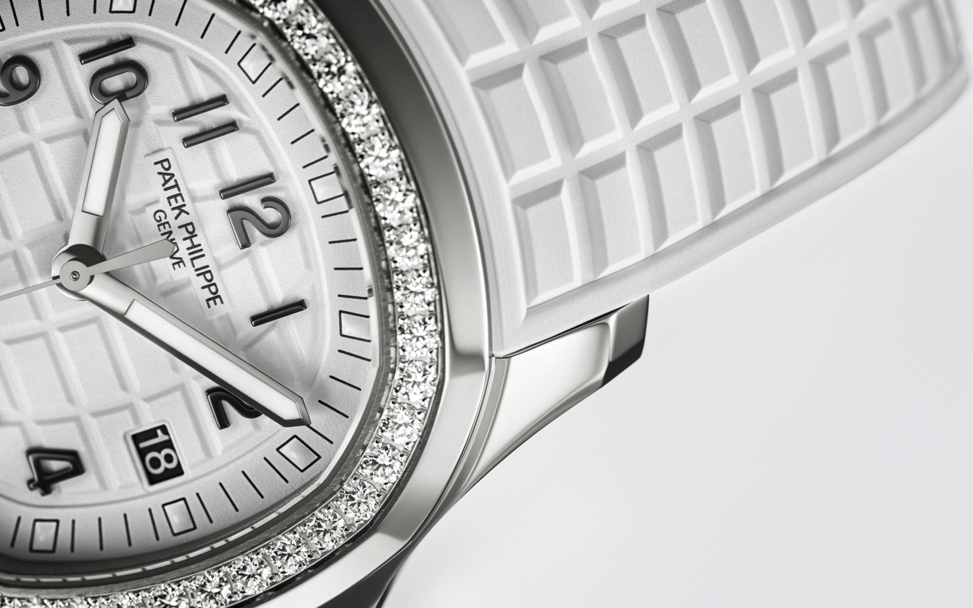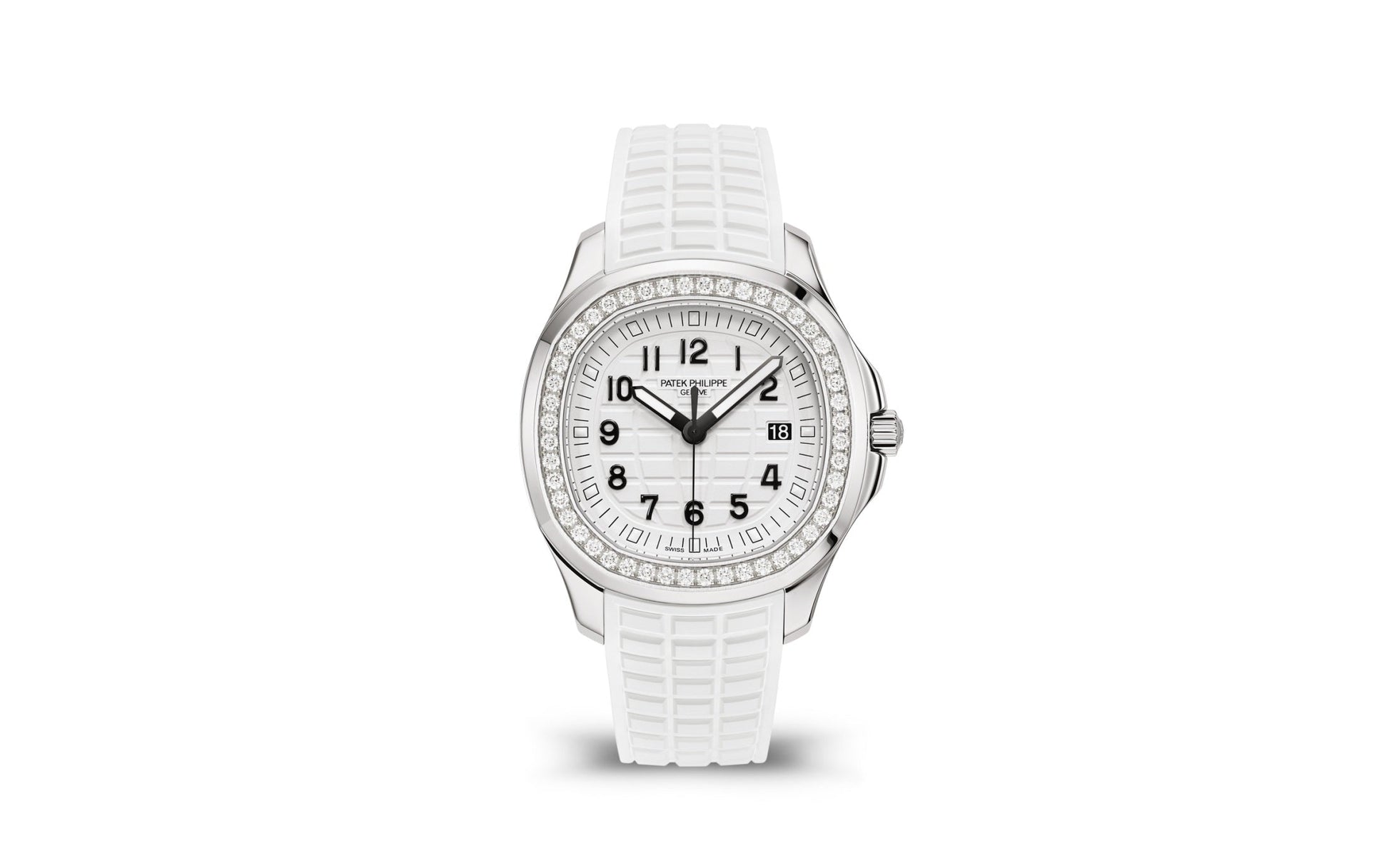 New Patek Philippe Aquanaut Luce luxury Ladies watch, with a larger diameter 38,8mm, Stainless Steel, Ref. 5267/200A-010. The first complex quartz wristwatch in the modern Aquanaut sports collection, which perfectly matches the character of this young and dynamic watch line. His Stainless Steel rounded, pillow-like octagon-shaped case and gently curved lugs, complemented by polished and satin finishes are unmistakable. On a beautiful Matte white dial with embossed "Aquanaut" harmoniously looks perfectly readable large applied polished Arabic numerals made of blackened 18k White Gold with luminescent coating in the form of hour markers. The manufacturer paid special attention to the second track on the outer rim of the dial, on which applied black lines with fairly wide luminous marks located every 5 minutes. Large polished luminous hour and minute hands in blackened 18k White Gold indicate the time. These are complemented by a slim and elegant second hand (Sweep seconds hand). The date window is traditionally at the 3 o'clock position. A polished Stainless Steel screw-down crown with a ribbed edge for a comfortable grip and the Patek Philippe logo is the finishing touch to the perfect picture. The dial is covered with a scratch-resistant sapphire crystal. The screw-down Solid case back is made of Stainless Steel. The elegant highlight of this model is the fixed sparkling Stainless Steel bezel set with 48 diamonds totaling 1,1cr with polished on the sides, provides a wide view of the dial. The finish on the side of the bezel is amazing because at first glance, it looks rounded, but upon closer inspection, you can see the crisp edges playing with the light. The model is equipped with a Patek Philippe caliber E 23‑250 S C with a Quartz movement powered by a silver oxide battery with a 3-year lifespan. This beautiful sport chic watch is presented on an Integrated matte white Composite material strap. He is highly resistant to wear, salt water and UV radiation. The strap are fastens with Patek Philippe's patented Stainless Steel folding clasp, polished and engraved with the Calatrava cross. Opening the clasp reveals the engraved Patek Philippe logo with the word GENEVE. Water resistant up to 120m/394ft (12 ATM).