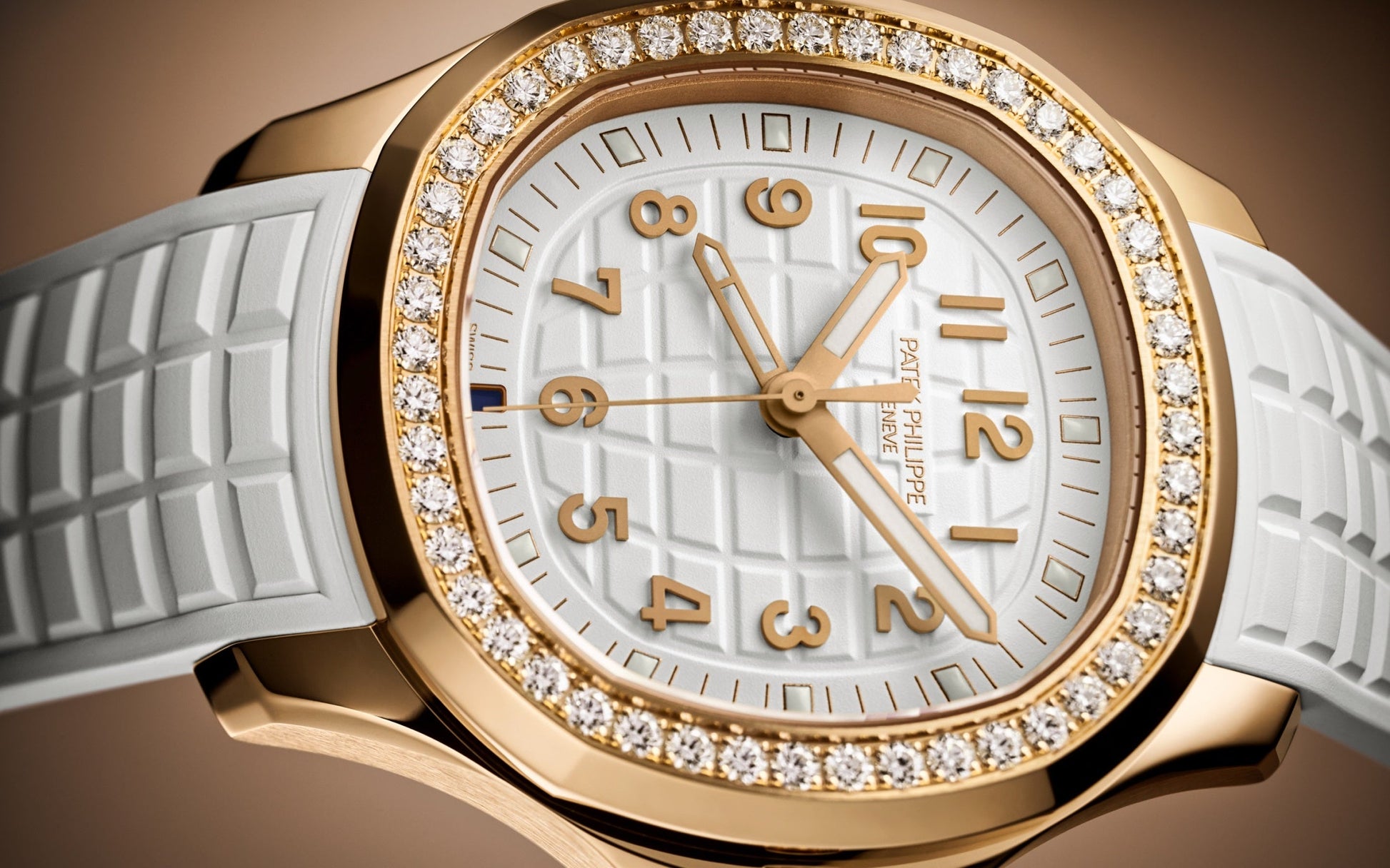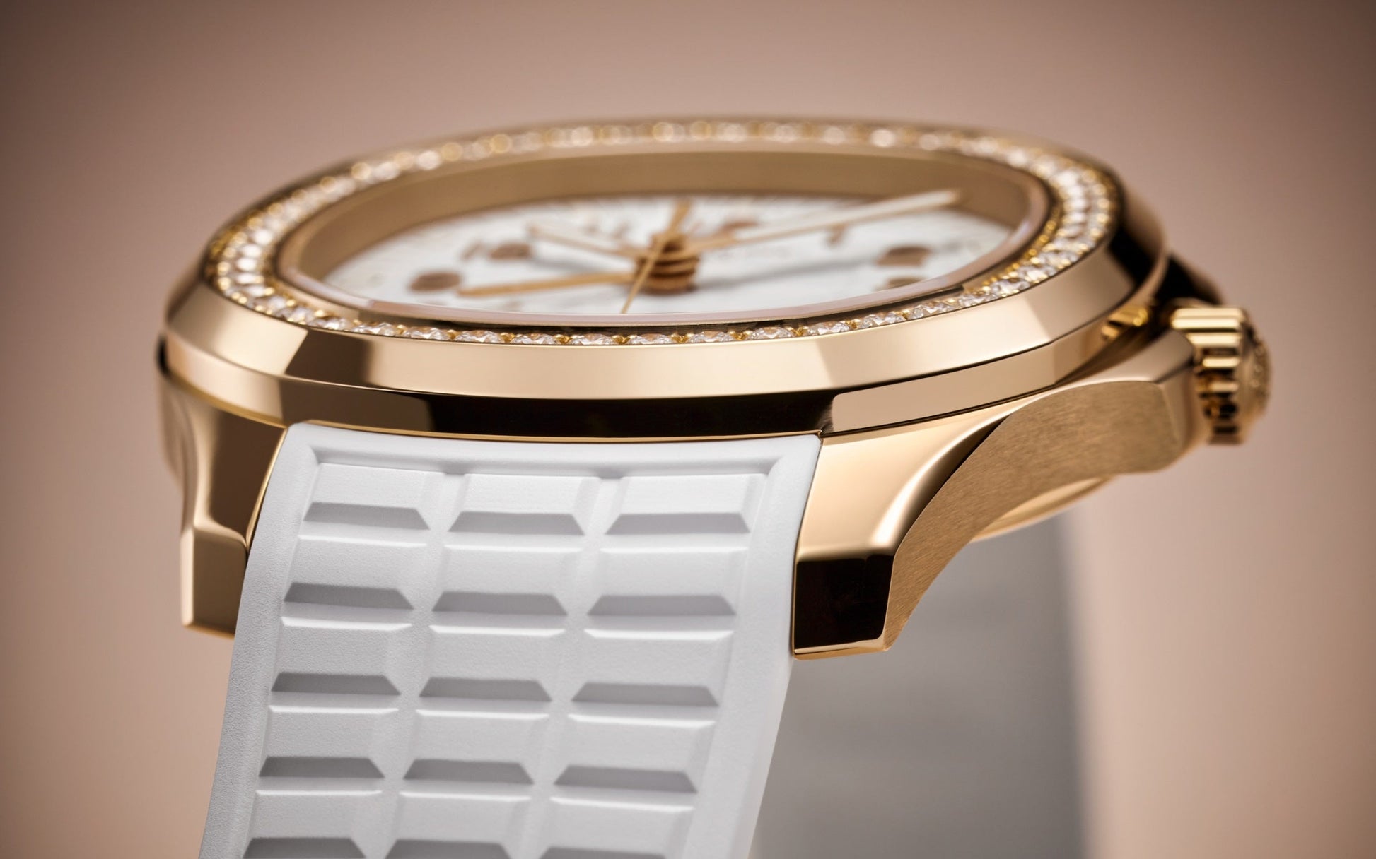 New Patek Philippe Aquanaut Luce Travel Time luxury Ladies watch, with a larger diameter 38,8mm, 18k Rose Gold, Ref. 5269/200R-001. The complex quartz wristwatch in the modern Aquanaut sports collection, which perfectly matches this character of young and dynamic watch line. The rounded octagonal 18k Rose Gold body and gently curved lugs, with polished flat surfaces and satin-finish sides are unmistakable. On a magnificent Matte white dial with embossed "Aquanaut" harmoniously looks perfectly readable large applied polished Arabic numerals made of 18k Rose Gold in the form of hour markers. The manufacturer paid special attention to the second track on the outer rim of the dial, on which applied rose gold tones lines with fairly wide luminous marks located every 5 minutes. Large polished luminous hour and minute hands in 18k Rose Gold indicate the time guarantee perfect readability even in the dark. These are complemented by a slim and elegant 18k Rose Gold second hand (Sweep seconds hand). In addition, this model has an additional skeleton hand, which indicates the time of the second time zone. Its setting is quite simple and is done using the crown. Moving forward one click, it sets the local time in increments of one hour forward or backward. Two clicks set the time and stop the movement. At the 6 o’clock, position there is an aperture for indicating the day and night of the home time zone. A polished 18k Rose Gold screw-down crown with inconspicuous and practical adjustment system with a ribbed edge for a comfortable grip and the Patek Philippe logo is the finishing touch to the perfect picture. The dial is covered with a scratch-resistant sapphire crystal. The screw-down Solid case back is made of 18k Rose Gold. The elegant highlight of this model is the fixed sparkling 18k rose gold bezel set with 48 Top Wesselton Pure round diamonds (~1.11 carats) flawless. The polishing on the sides impresses with classic precision. It also looks amazing because at first glance it looks rounded, but on closer inspection you can see the crisp edges playing with the light. The model is equipped with a Patek Philippe caliber E 23‑250 S FUS 24H with a Quartz movement. This beautiful sport chic watch is presented on an Integrated Matt-white strap that continues the visual harmony of the design made of Composite material. He is highly resistant to wear, salt water and UV radiation. The strap are fastens with Patek Philippe's patented 18k Rose Gold folding clasp, polished and engraved with the Calatrava cross. Opening the clasp reveals the engraved Patek Philippe logo with the word GENEVE. Water resistant up to 60m/200ft (6 ATM).