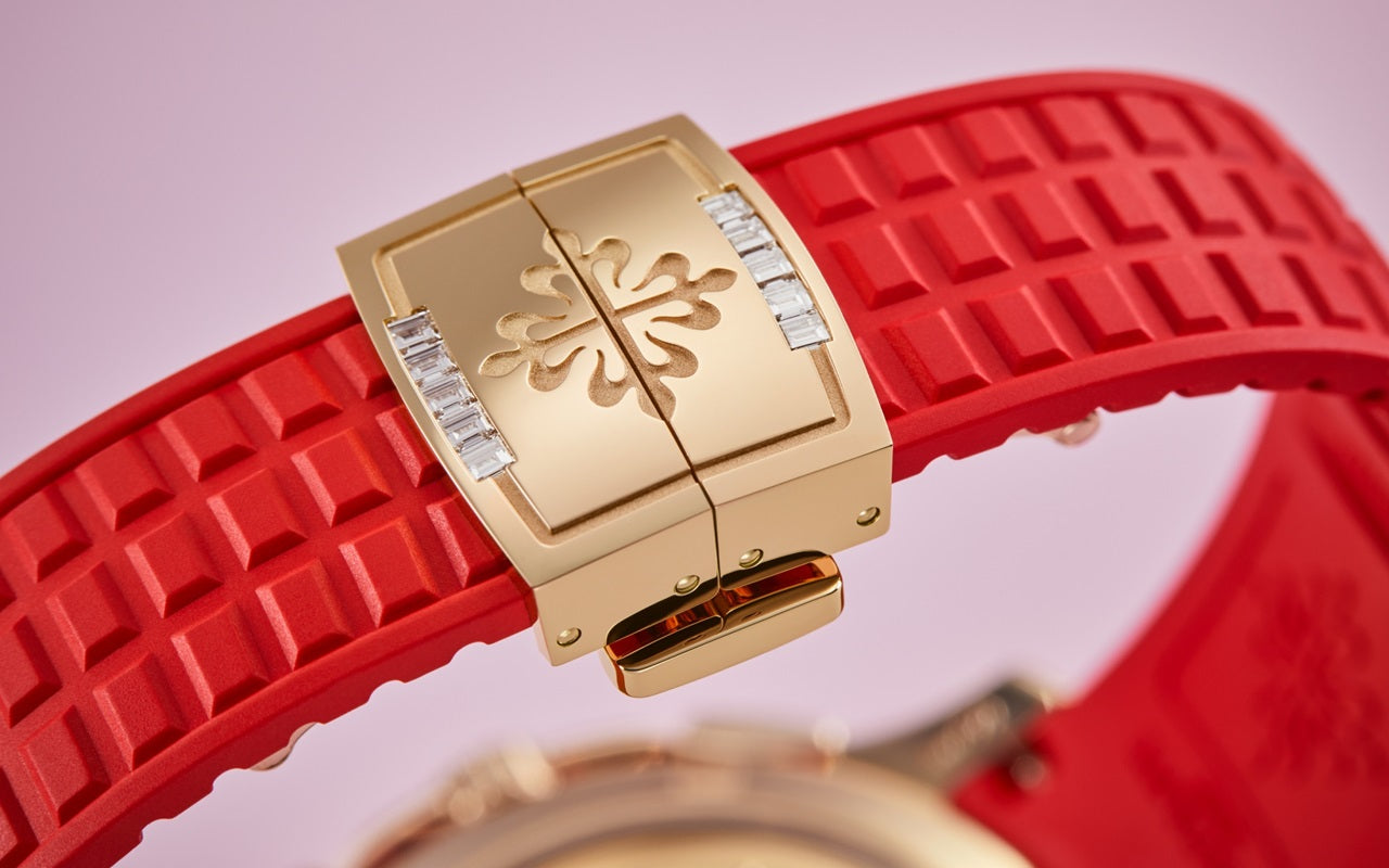 Introducing the Patek Philippe Aquanaut Luce "Rainbow" Chronograph 7968-300R-001, a dazzling embodiment of luxury and vibrant style. This exceptional women's watch features a 39.9mm rose gold case, beautifully accentuated by a rainbow-colored array of sapphires on the bezel, creating an eye-catching display of elegance and modernity. The dial White mother-of-pearl, engraved with Aquanaut pattern, baguette multicolored sapphire hour markers and gold applied numerals. This model also introduces a new function to the Aquanaut collection: a 30-minute chronograph, enhancing its functionality with a stylish sub-dial at 6 o'clock. Driven by the caliber CH 28-520, an automatic movement renowned for its precision and reliability, this watch offers a power reserve of 45-55 hours. The sapphire crystal case back allows enthusiasts to admire the intricate mechanics of the movement, showcasing Patek Philippe's commitment to horological excellence. The Composite material, red strap mirrors the dial's texture and secures comfortably with a fold-over clasp, ensuring the watch remains a constant, comfortable presence on the wrist. Additionally, it boasts water resistance up to 30 meters, making it suitable for varied everyday activities.