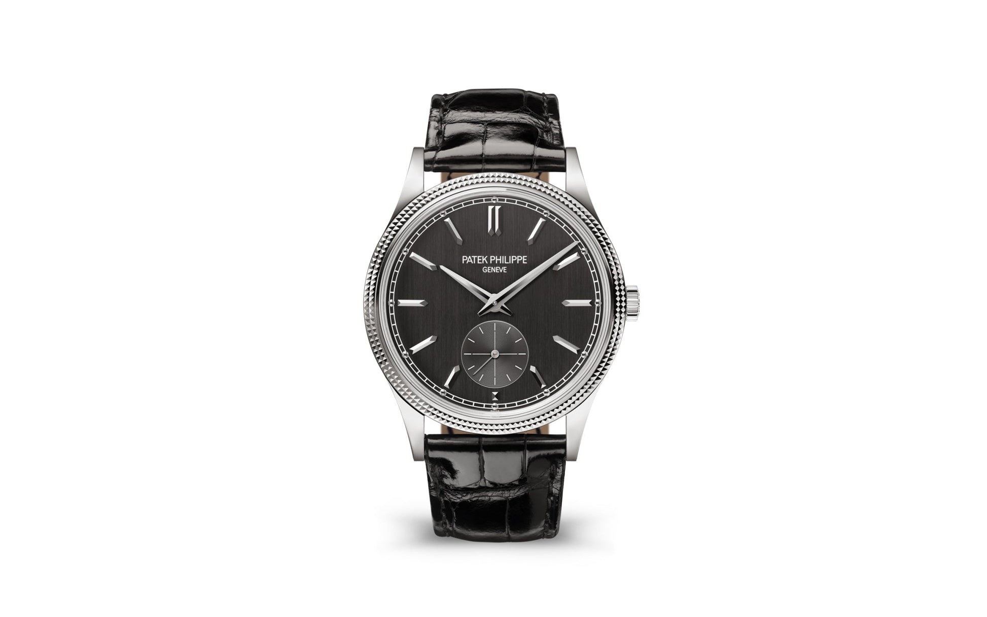 Luxury Patek Philippe Calatrava, 18k White Gold, 39mm and Reference 6119G-001. Their distinguishing feature is a charcoal grey dial with a vertical satin finish. Applied 18k White Gold faceted hour markers in the shape of boats and hour markers with 18k White Gold dots on a white minute scale around the perimeter in a railway style look stylish on it. The dauphin sword-shaped hour and minute hands in 18K White Gold, as well as the recessed gray small sub-dial with a permanent second hand with white markers and a gold indicator hand, are spectacular. A polished 18k White Gold Screw-down crown with a ribbed edge for easy grip and the Patek Philippe logo is located on the right side of the case. The dial closed by a Scratch-resistant Sapphire Crystal and sapphire-crystal case back which allows of the case, allows you to see the magical work of the movement. The watch features the recognizable polished downward-turning lugs and the bezel fixed in 18K White Gold with a guilloche “Clous de Paris” pattern in the form of double-row stepped jagged nails. The watch Patek Philippe Caliber 30‑255 PS mechanical manually wound movement, containing 27 Jewels, and has a power reserve of 65 hours. This model, presented on is on shiny black Alligator leather strap with square scales and hand-stitched. It zips up 18k White Gold Prong buckle. The water resistance is up to 30m/100ft (3 ATM).