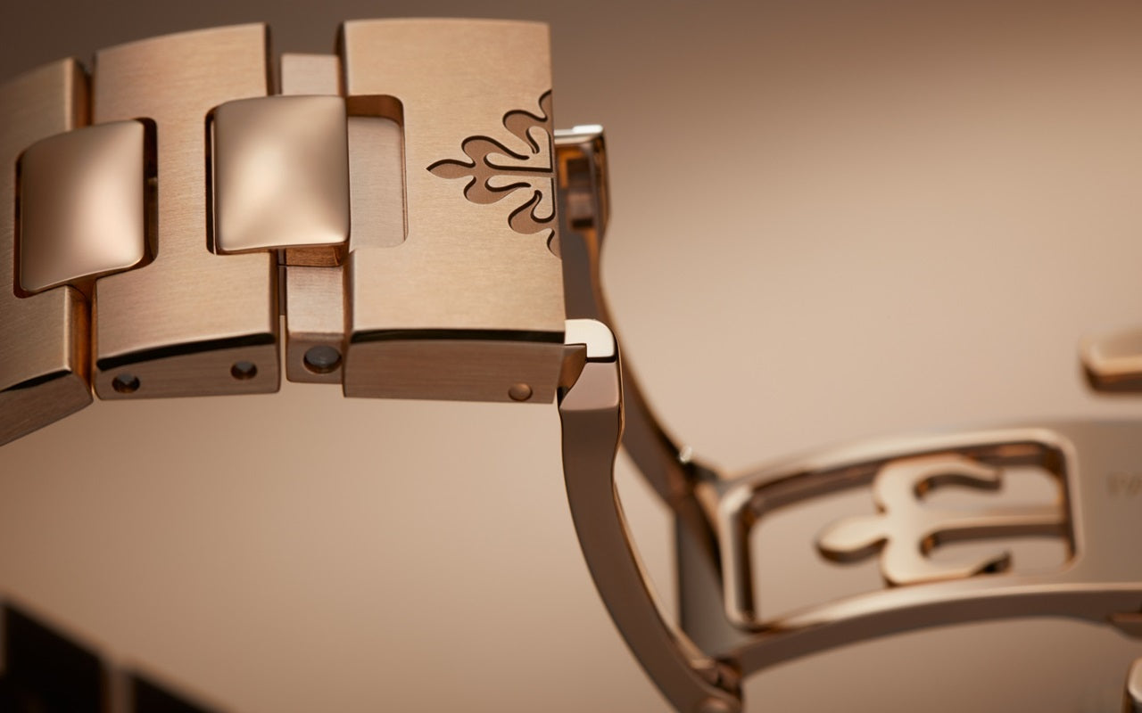Introducing the Patek Philippe Nautilus 5712-1R-001, a masterpiece of horological artistry, crafted from luxurious 18k rose gold. This 40mm timepiece embodies the distinctive Nautilus design with its porthole-inspired case and beautifully embossed dial, appealing to those who appreciate classic elegance combined with modern functionality. The dial of this watch features a stunning brown color with a subtle gradient effect, complemented by rose gold applied hour markers and numerals that are both stylish and legible. It includes an intuitive moon phase display, small seconds sub-dial, and date indicator, which are not only functional but enhance the watch's aesthetic appeal. Additionally, a power reserve indicator ensures that the wearer is always informed about the watch's status, making it as practical as it is beautiful. Powered by Patek Philippe's Caliber 240 PS IRM C LU, this self-winding mechanical movement is renowned for its precision and reliability. The sapphire-crystal case back allows an unobstructed view of the intricate movements, showcasing the refined craftsmanship Patek Philippe is known for. Completing this exquisite timepiece is a matching 18k rose gold bracelet, which fits comfortably and securely with a fold-over clasp. The watch's water resistance up to 60 meters makes it suitable for various occasions, from formal events to casual outings.