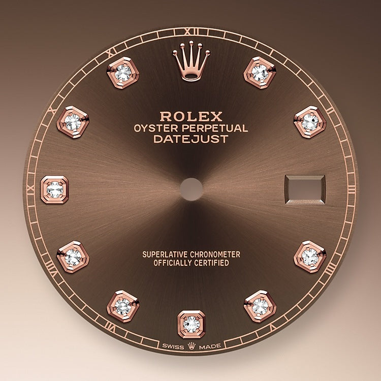 Rolex Datejust 41 watch with polished 18k Everose Gold and Stainless Steel case, Reference 126331-0004. This model has Chocolate dial with a fine sunray. The dial is adorned with polished 18k Everose Gold hands and Hour markers are 10 Diamonds in 18k Everose Gold settings. Fine printed minute track on teh dial perimeter. Moreover, every five minutes are marked with Roman numerals. Date window with a "Cyclops" magnifying lens displayed at the 3 o'clock position. Polished 18k Everose Gold "Twinlock" crown, featuring two sealed zones when the crown is screwed down: the first inside the tube of the crown, the second inside the winding crown itself. The dial closed by a Scratch-resistant Sapphire Crystal and solid case back made. The watch is equipped Fluted fixed polished 18k Everose Gold bezel. The watch is mechanical self-winding Manufacture Rolex 3235 contains 31 Jewels and has an approximate power reserve of 70 hours of power reserve. This model presented on Jubilee bracelet of brushed Stainless Steel outer links and polished 18k Everose Gold center links with a Folding Oysterlock safety clasp with Easylink 5 mm comfort extension link. The water resistance is up to 100m/330ft (10 ATM).