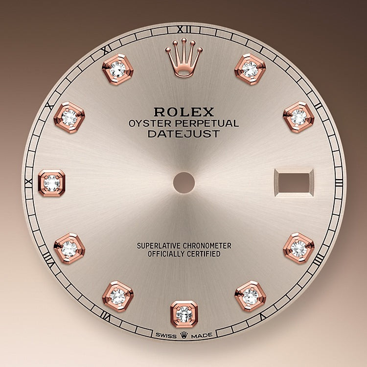 Rolex Datejust 41 watch with polished 18k Everose Gold and Stainless Steel case, Reference 126331-0007. This model has Sundust dial with a fine sunray. The dial is adorned with polished 18k Everose Gold hands and Hour markers are 10 Diamonds in 18k Everose Gold settings. Fine printed minute track on teh dial perimeter. Moreover, every five minutes are marked with Roman numerals. Date window with a "Cyclops" magnifying lens displayed at the 3 o'clock position. Polished 18k Everose Gold "Twinlock" crown, featuring two sealed zones when the crown is screwed down: the first inside the tube of the crown, the second inside the winding crown itself. The dial closed by a Scratch-resistant Sapphire Crystal and solid case back made. The watch is equipped Fluted fixed polished 18k Everose Gold bezel. The watch is mechanical self-winding Manufacture Rolex 3235 contains 31 Jewels and has an approximate power reserve of 70 hours of power reserve. This model presented on Oyster bracelet of brushed Stainless Steel outer links and polished 18k Everose Gold center links with a Folding Oysterlock safety clasp with Easylink 5 mm comfort extension link. The water resistance is up to 100m/330ft (10 ATM).
