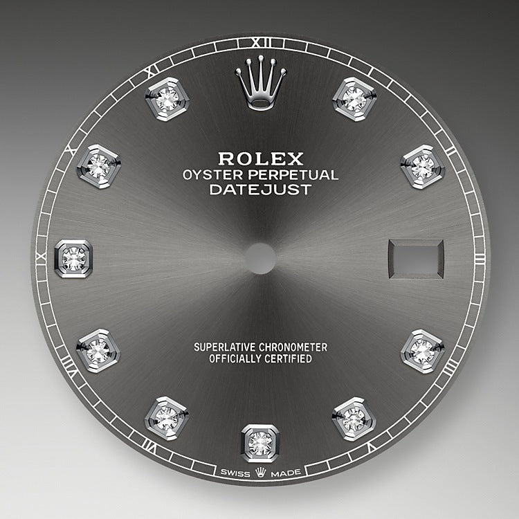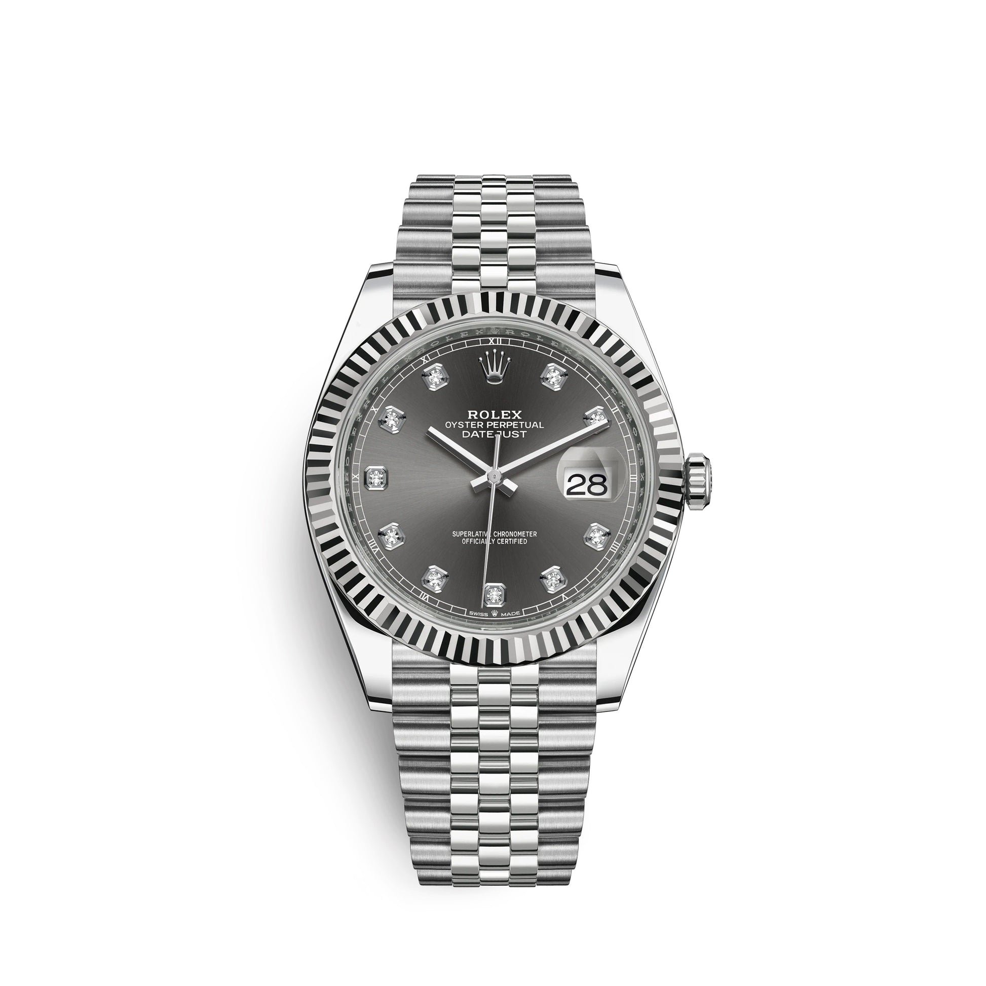 Rolex Datejust 41 watch with polished Stainless Steel and 18k White Gold case, Reference 126334-0006. This model has Grey "dark rhodium" dial with a fine sunray and Hour markers are 10 Diamonds in 18k White Gold settings. The dial is adorned polished hands - hour and minute hands with partial luminous fill. Fine printed minute track on teh dial perimeter. Moreover, every five minutes are marked with Roman numerals. Date window with a "Cyclops" magnifying lens displayed at the 3 o'clock position. Polished Stainless Steel "Twinlock" crown, featuring two sealed zones when the crown is screwed down: the first inside the tube of the crown, the second inside the winding crown itself. The dial closed by a Scratch-resistant Sapphire Crystal and solid case back made. The watch is equipped Fluted fixed polished 18k White Gold bezel. The watch is mechanical self-winding Manufacture Rolex 3235 contains 31 Jewels and has an approximate power reserve of 70 hours of power reserve. This model presented on Jubilee Stainless Steel bracelet of brushed outer links and polished center links with a Folding Oysterlock safety clasp with Easylink 5 mm comfort extension link. The water resistance is up to 100m/330ft (10 ATM).