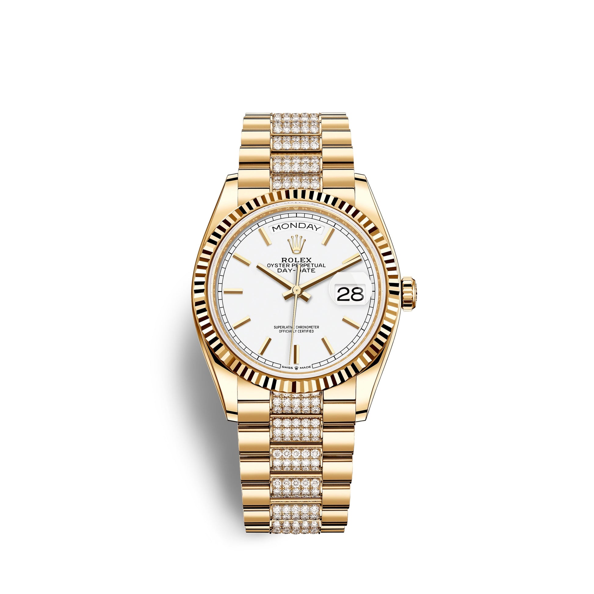 Unworn classic Rolex Day-Date, 36mm, 18k Yellow Gold, Ref# 128238-0082 - luxury, elegance and practicality.