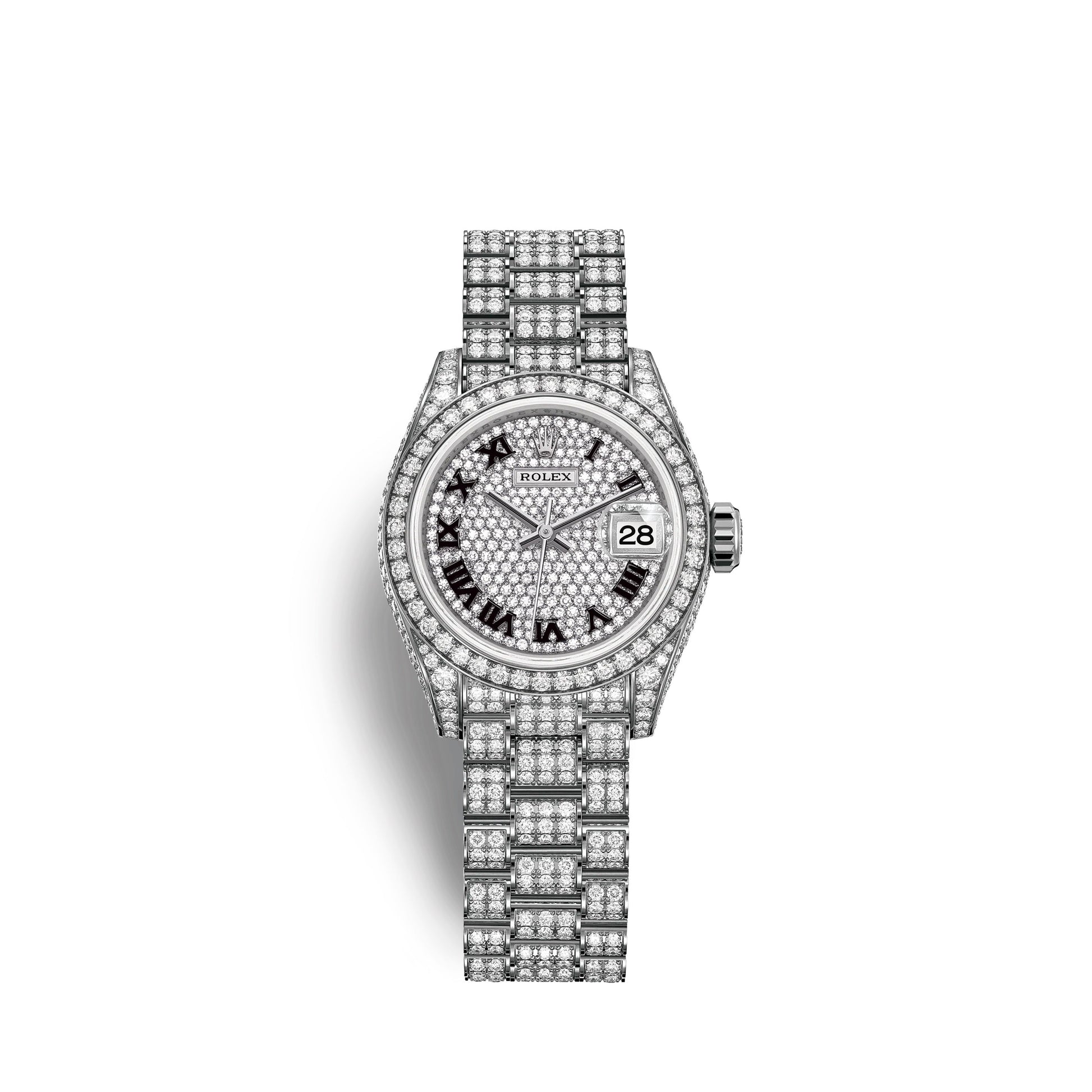 - Dial color: Diamond-paved dial set with 291 diamonds and a applied polished black Roman numerals as hour markers