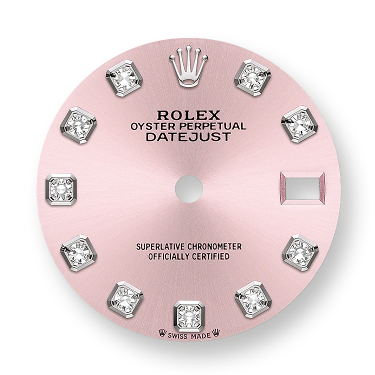 - Dial color: Pink dial with a fine sunrays and 10 Diamonds as hour markers framed in 18k White Gold
