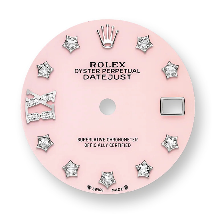 - Dial color: Pink opal dial with Nine diamonds set in star-shaped framed in 18k White Gold settings and 8 diamonds set in Roman numeral IX framed in 18k White Gold