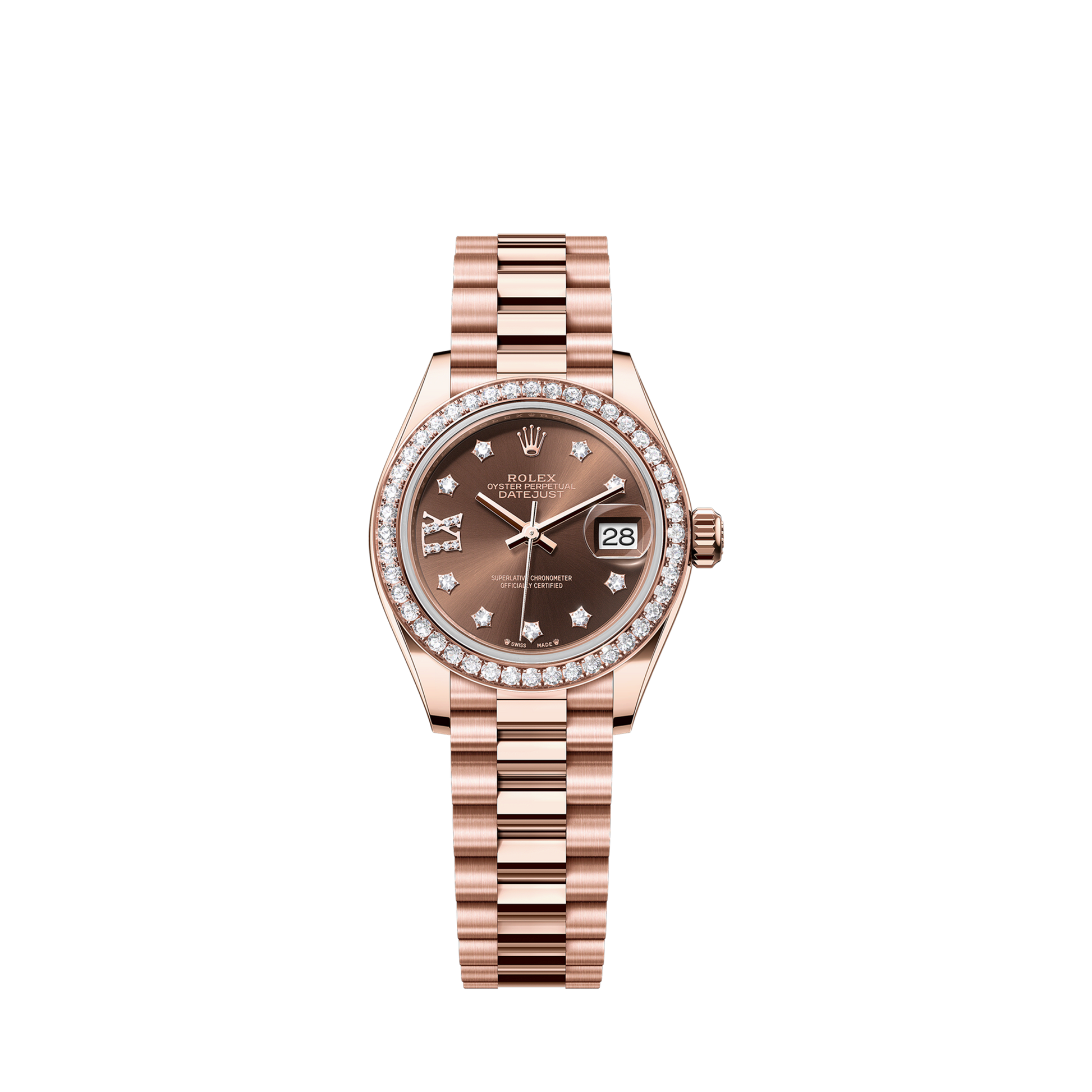 Unworn Rolex Lady-Datejust 279135rbr-0001. 28 mm. Chocolate Star Diamond Dial. Set with diamonds Bezel. Scratch-resistant sapphire, Cyclops lens over the date Crystal. Everose gold Case. 2236 Calibre. Perpetual, mechanical, self-winding Movement. 55 hours Power reserve. Everose gold bracelet with Concealed folding Crownclasp. 100 metres / 330 feet Water resistance.