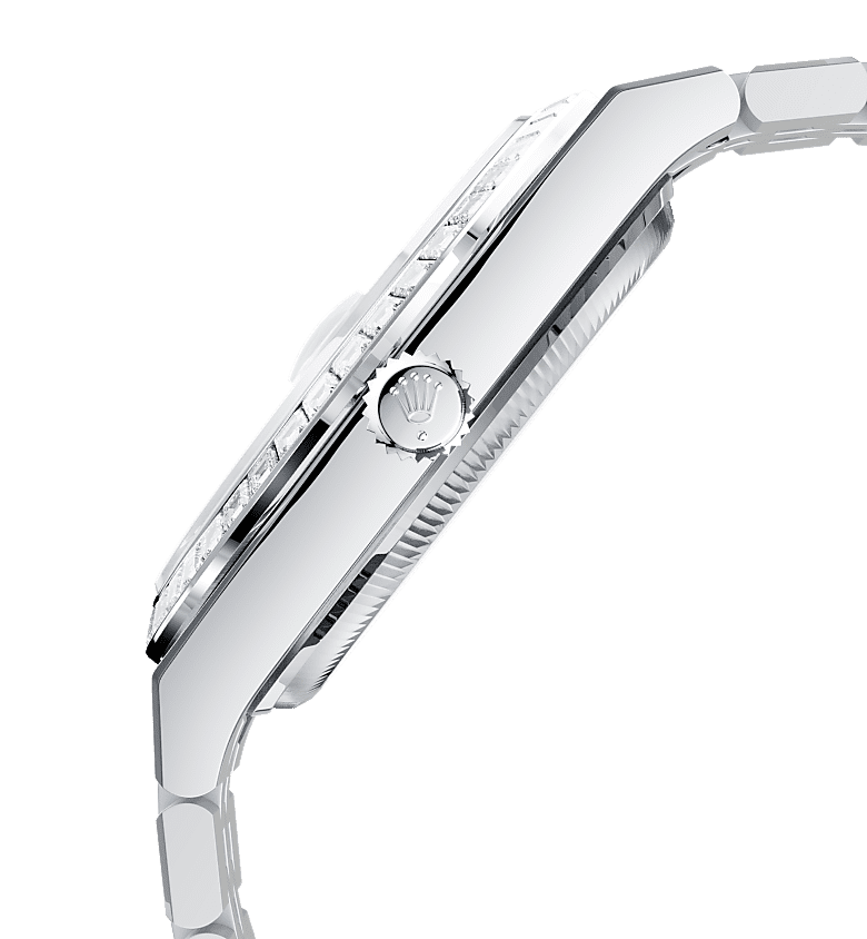 The flawless Platinum bezel, expertly set with 44 baguette-cut diamonds, is a testament to the harmonious fusion of craftsmanship and art. Surgically crafted, each precious diamond is set with unwavering precision in a specially prepared bezel housing. The uniform height and flawless alignment of each stone to precise symmetry are a reflection of Rolex’s uncompromising standards.