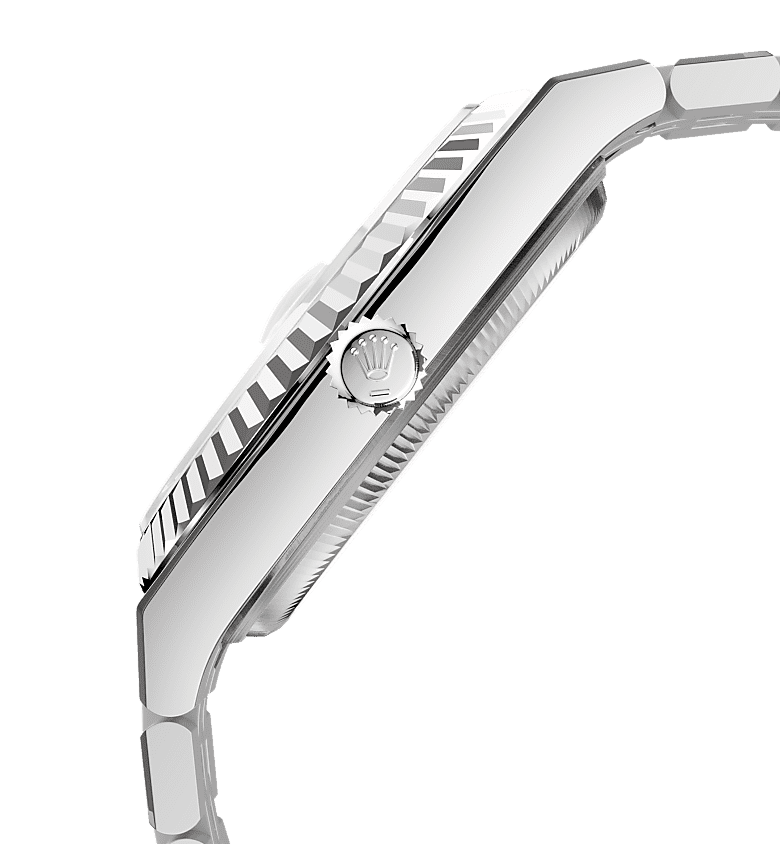 The watch is fitted with a newly designed integrated Flat Jubilee bracelet, comprising five-piece solid links in Oystersteel. The bracelet features polished center links and satin-finished outer links with polished edges, providing both comfort and a refined appearance. A concealed folding Crownclasp ensures a seamless look and secure fit.