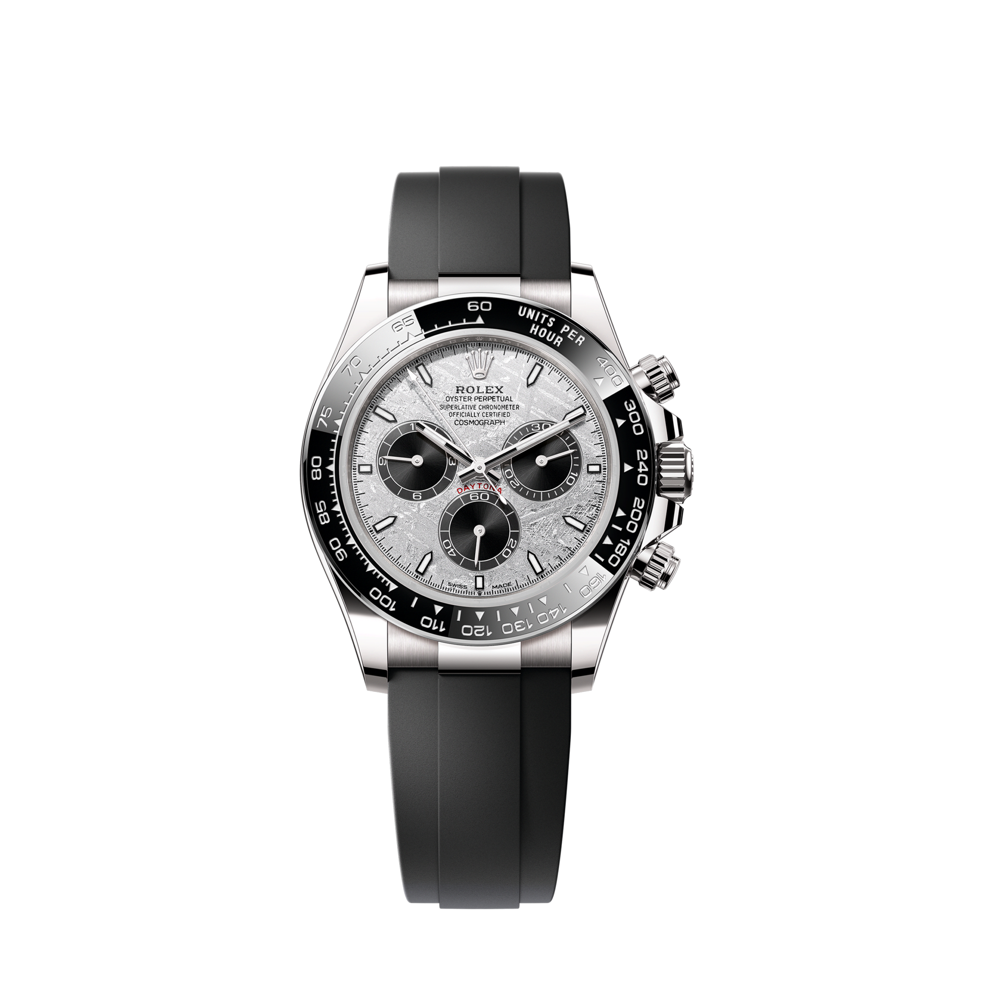 Introducing unworn watch Rolex Cosmograph Daytona 40mm, 18k White Gold, Ref# 126519ln-0007. Born for motor racing, the watch combines sporty chic with versatility, making it a must-have for lovers of the fast lanes and the finest cars. The luxurious new 2025 is synonymous with excellent workmanship, first-class technical features and unique looks. The Meteorite dial, adorned with black spray-coated chronograph counters, provides an expressive backdrop for the 18k White Gold applique hour markers and hands, which are filled with Chromalight, a luminescent material that ensures legibility in low-light conditions. Sophisticated timepiece features a classic chronograph layout designed for precision and performance. At the center, the hour and minute hands provide clear timekeeping, while a small second’s sub-dial positioned at 6 o’clock adds balance and elegance. For chronograph functionality, a 30-minute counter complements the central seconds hand at 3 o’clock and a 12-hour counter at 9 o’clock—ideal for tracking elapsed time with accuracy. Additionally, the stop-seconds function ensures precise time setting, catering to those who value meticulous synchronization. A well-readable minute scale is applied along the outer contour of the dial. All this charm is complemented by a ribbed, for a comfortable grip, screw-down crown in 18k White Gold with the Rolex logo, which has a triple Triplock water-resistance system. At the 2 and 4 o’clock, positions are the chronograph control buttons made of 18k White Gold. The dial is covered with a scratch-resistant sapphire crystal and a solid 18k White Gold case back. The Black monobloc Cerachrom bezel in ceramicfeatures an engraved tachymetric scale, enabling drivers to measure average speeds up to 400 units per hour, a nod to its racing heritage. At the heart of this timepiece lies the Self-winding mechanical movement Rolex Calibre 4131, contains 47 jewels and has an approximate power reserve approximately of 72 hours, ensuring exceptional precision and reliability. This spectacular timepiece is presented on an Oysterflex bracelet of flexible metal blades overmoulded with high-performance elastomer. The 18k White Gold Folding Oysterlock safety clasp with Rolex Glidelock extension system comfort, made using own unique Rolex technologies, guarantees maximum comfort on the wrist. Water resistant up to 100m/330ft (10 ATM).