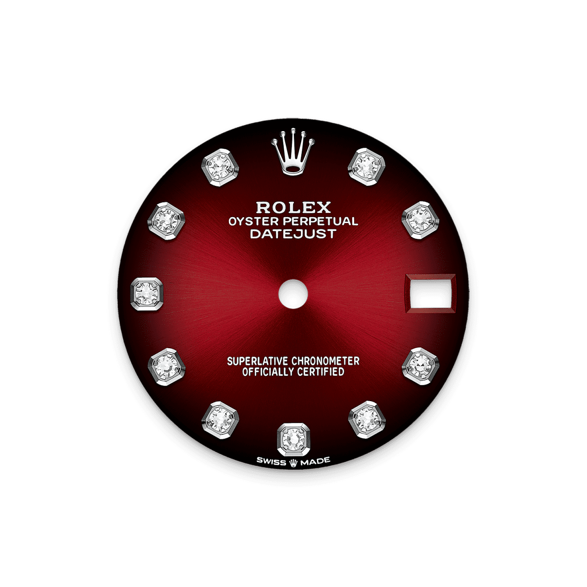 Introducing unworn classic Rolex Datejust 31 watch, Reference 278289rbr-0028a masterful blend of elegance and precision, showcasing Rolex's commitment to timeless design and exceptional craftsmanship. Crafted from 18k White Gold, the 31mm Oyster case exudes a warm, luxurious glow. This iconic model has red ombré dial, transitioning from a vibrant center to a deep black edge, is set with diamonds, creating a captivating visual effect. This design pays homage to a style Rolex introduced in the 1980s and reintroduced in 2019, involving a delicate application of black lacquer to achieve the gradient effect. At the heart of its design, the dial proudly displays an applied 18k White Gold Rolex Crown at 12 o’clock, accompanied by traditionally polished 18k White Gold hands that glide with effortless precision. The iconic Cyclops lens, ensuring superior readability, magnifies the signature date window at 3 o’clock. Special attention is given to the screw-down crown, crafted from 18k White Gold and finished with a ribbed edge for secure handling. Embellished with the Rolex emblem on its tip, it incorporates the Twinlock double waterproofness system, ensuring reliable resistance to moisture and dust. Protecting the dial is a scratch-resistant sapphire crystal, seamlessly paired with a solid case back for enhanced durability. Framing the dial is a fixed, bezel in 18k White Gold artfully set with 46 flawless round brilliant diamonds, embodying the watch’s refined aesthetic. Powering this piece is the in-house Rolex Caliber 2236 — a self-winding mechanical movement boasting 31 jewels and a 55-hour power reserve. Engineered with Rolex’s patented Chronergy escapement and Parachrom hairspring, this movement ensures unmatched precision, resilience to shocks and magnetic fields, and outstanding performance. The timepiece is fitted with the iconic 18k White Gold President bracelet, characterized by its semi-circular three-piece links, providing both comfort and a distinguished aesthetic. The bracelet's concealed Crownclasp ensures seamless integration with the case, maintaining the watch's elegant profile. The water resistance is up to 100m/330ft (10 ATM).