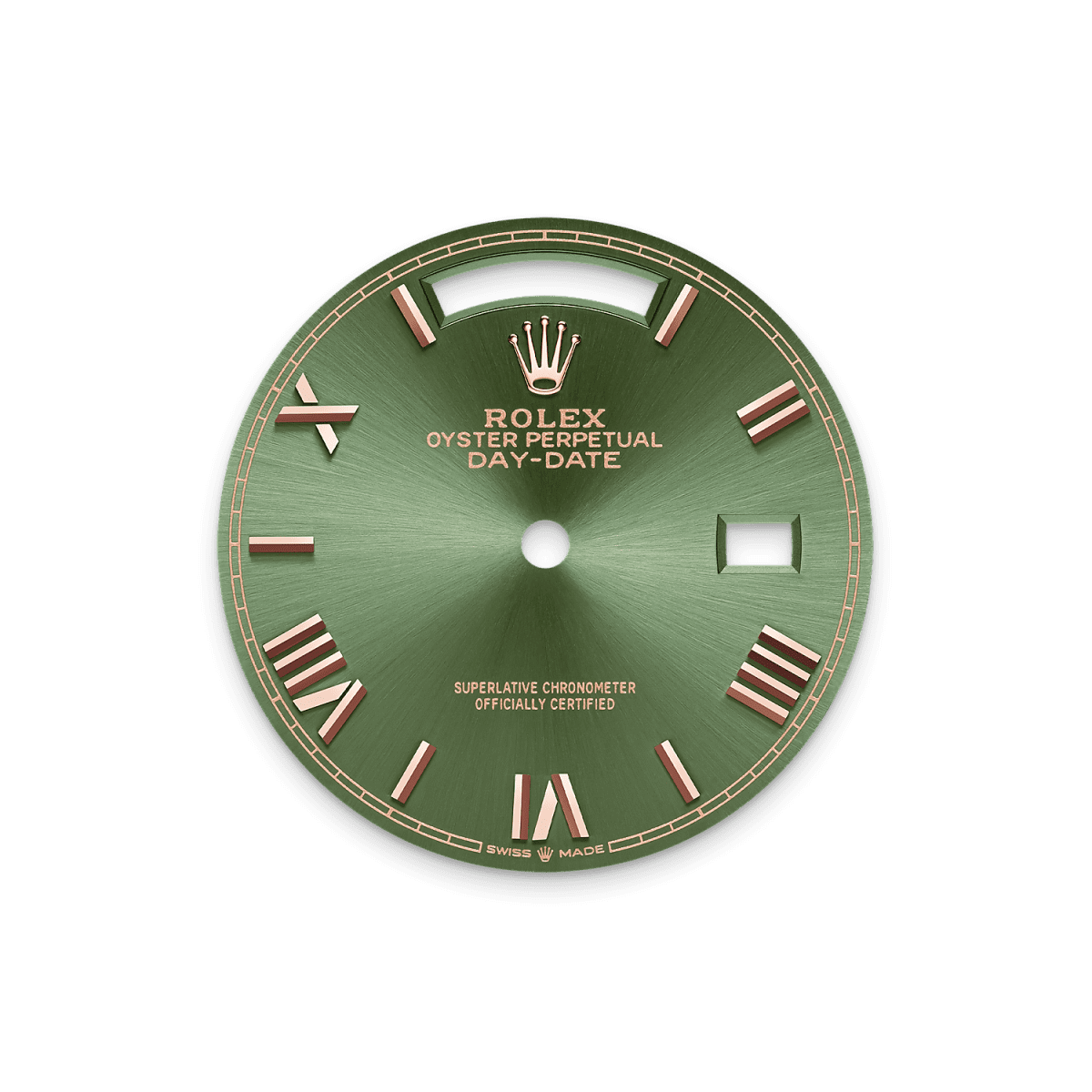 Introducing unworn watch Rolex Day-Date 36, 18k Everose Gold, 36mm, Ref# 128395tbr-0033. Prestigious Day-Date watches remain at the cutting edge of modernity, despite the many decades passing by. As always elegant and luxurious, they are an excellent choice for people who value unique beauty, high style and absolute comfort. New for 2025 in the Rolex Day-Date 36, line is a model with an Olive Green dial sunray finish creates delicate light, with highly legible Chromalight display with long-lasting blue luminescence. Its classic polished 18k Everose Gold Roman numerals and hands made of 18k Everose Gold look amazing on such a dial, emphasizing the sophistication of the model. The date indicator is traditionally placed at the 3 o'clock position. At the 12 o’clock, position is a semi-circular window showing the day of the week in full, providing an instantly recognizable, unique design of Day-Date. A minute scale in the form of a railway track runs along the contour of the dial, which increases the functionality. The ribbed screw-down crown in 18k Everose Gold Triplock with double watertight system, adorned with the Rolex logo, is a traditionally recognizable part of Rolex watches. The dial is covered with a scratch-resistant anti-reflective sapphire crystal and a Cyclops lens above the date with double anti-reflective coating. A solid 18k Everose Gold screw-down case back with fine fluted edges, closes the movement. The bezel of this watch, expertly set with 60 flawless square diamonds, is a testament to the harmonious fusion of craftsmanship and art. Surgically crafted, each precious diamond is set with unwavering precision in a specially prepared bezel housing. The uniform height and flawless alignment of each stone to precise symmetry are a reflection of Rolex's uncompromising standards. The in-house Rolex mechanical movement, caliber 3255, contains 31 jewels and has an approximate power reserve of approximately 70 hours powers. This delightful timepiece is presented on an 18k Everose Gold President bracelet with semi-circular 3-piece links for flawless beauty. It features Rolex's original concealed folding Crownclasp to secure the watch on your wrist. Water resistant up to 100m/330ft (10 ATM).