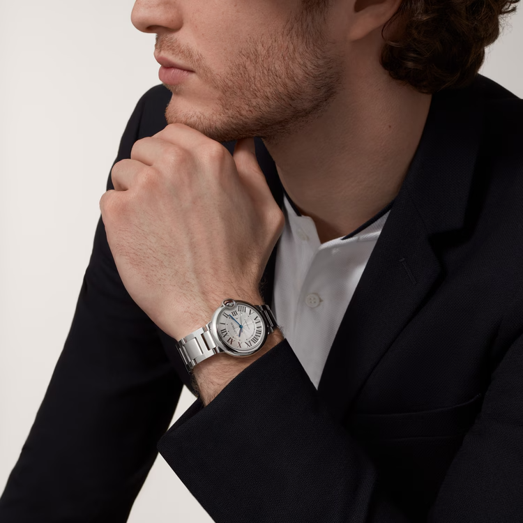 Exuding timeless elegance and masterful craftsmanship, the Cartier Ballon Bleu 36mm Watch Ref# WSBB0048 is a sophisticated expression of modern luxury. Encased in polished Stainless Steel, this timepiece showcases a gracefully rounded silhouette that exemplifies the collection’s signature design language. The Silvered dial, with guilloche textured center features bold Black printed Roman numeral hour markers, radiating from the signature crown curve—creating a striking visual rhythm and blued steel sword-shaped hands ensure both classic appeal and legibility. In the center of the dial is an exquisite minute track, where a distinct square indicator marks each five-minute increment. This thoughtful layout offers a modern twist on traditional timekeeping, combining clarity with character. At its heart is a Swiss-made automatic movement, delivering reliable, self-winding performance for the modern woman who appreciates mechanical precision. Adding a signature touch of elegance, the fluted Stainless Steel crown is adorned with a synthetic blue sapphire cabochon, subtly integrated into the case profile. A scratch-resistant sapphire crystal protects the dial, while a solid case back ensures durability and refinement. Paired with a luxurious Interchangeable brushed and polished Stainless Steel bracelet and secured by a matching Stainless Steel Hidden Folding Clasp, this timepiece delivers exceptional comfort and enduring style. Water-resistant up to 30 meters (100 feet), the Ballon Bleu WSBB0048 is a perfect fusion of form and function—refined for the modern person.