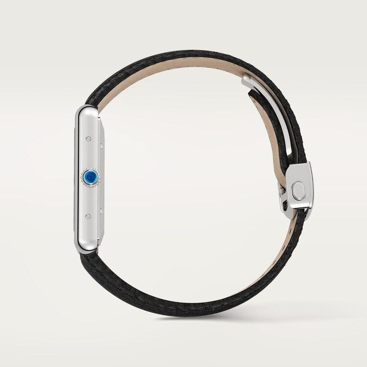 Introducing unworn the Cartier Tank Must de Cartier watch, reference WSTA0040, is a refined expression of the brand's iconic Tank design, blending historical elegance with modern craftsmanship. This extra-large model features a 41mm x 31mm Stainless Steel case with a thickness of 8.4mm, offering a substantial yet comfortable presence on the wrist. The watch features a sophisticated silver dial that catches the light with understated sophistication. The flat perimeter provides a clean, modern frame with large black Roman numerals serving as hour markers. The center of the dial features a flinqué texture, an intricate detail that adds depth and elegance. A minute track, reminiscent of a train track, runs along the border, enhancing functionality. The harmonious contrast between smooth and textured surfaces enhances the visual appeal of the dial, making it both timeless and distinctive. The blued steel sword-shaped hands and date aperture at 6 o'clock are protected by scratch-resistant sapphire crystal. Powered by Cartier’s in-house caliber 1847MC automatic movement, beating at 28,800 vph with 23 jewels and offering a 42-hour power reserve, powers this model. The beaded crown is adorned with a blue synthetic cabochon-shaped spinel, adding a touch of sophistication. Completing the timepiece is a black grained calfskin strap with an interchangeable steel deployant buckle, allowing for versatility and ease of wear. Having water-resistant up to 3 bar (approximately 30 meters/100 feet), the Tank Must WSTA0040 combines timeless design with practical functionality, making it a distinguished choice for those seeking a classic yet contemporary wristwatch.