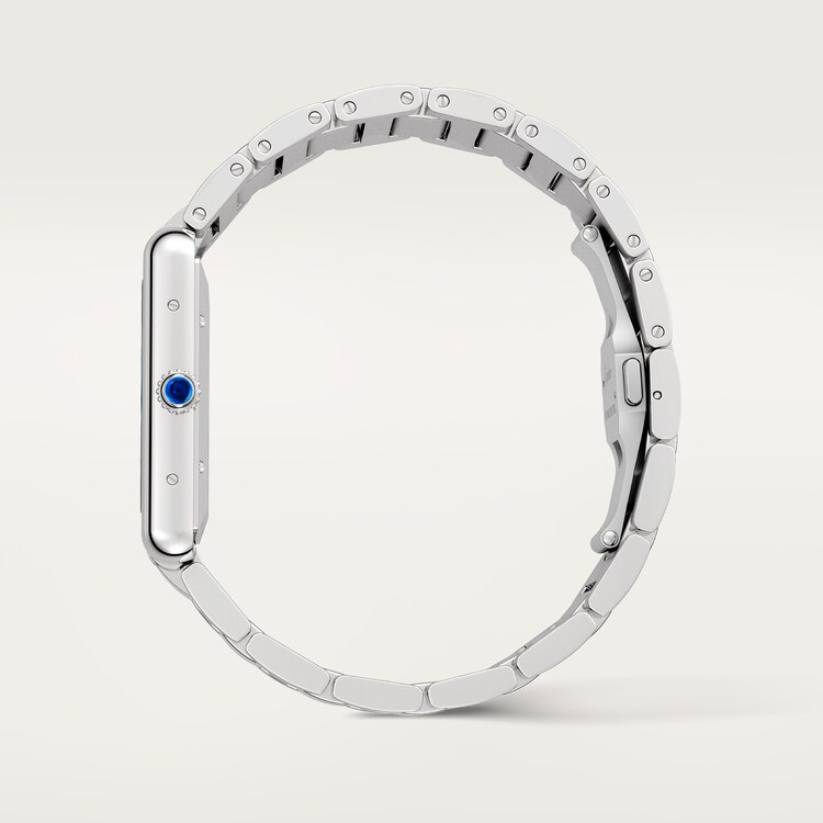 Introducing unworn the Cartier Tank Must de Cartier watch, reference WSTA0053, is a refined expression of the brand's iconic Tank design, blending historical elegance with modern craftsmanship. This extra-large model features a 41mm x 31mm Stainless Steel case with a thickness of 8.4mm, offering a substantial yet comfortable presence on the wrist. The watch features a sophisticated Silvered dial that catches the light with understated sophistication. The flat perimeter provides a clean, modern frame with large black Roman numerals serving as hour markers. The center of the dial features a flinqué texture, an intricate detail that adds depth and elegance. A minute track, reminiscent of a train track, runs along the border, enhancing functionality. The harmonious contrast between smooth and textured surfaces enhances the visual appeal of the dial, making it both timeless and distinctive. The blued steel sword-shaped hands and date aperture at 6 o'clock are protected by scratch-resistant sapphire crystal. Powered by Cartier’s in-house caliber 1847MC automatic movement, beating at 28,800 vph with 23 jewels and offering a 42-hour power reserve, powers this model. The beaded crown is adorned with a blue synthetic cabochon-shaped spinel, adding a touch of sophistication. The watch is paired with an interchangeable brushed and polished Stainless Steel bracelet, secured by a Stainless Steel Push Button Folding Clasp, ensuring both comfort and style. Having water-resistant up to 3 bar (approximately 30 meters/100 feet), the Extra-large Tank Must WSTA0053 combines timeless design with practical functionality, making it a distinguished choice for those seeking a classic yet contemporary wristwatch.