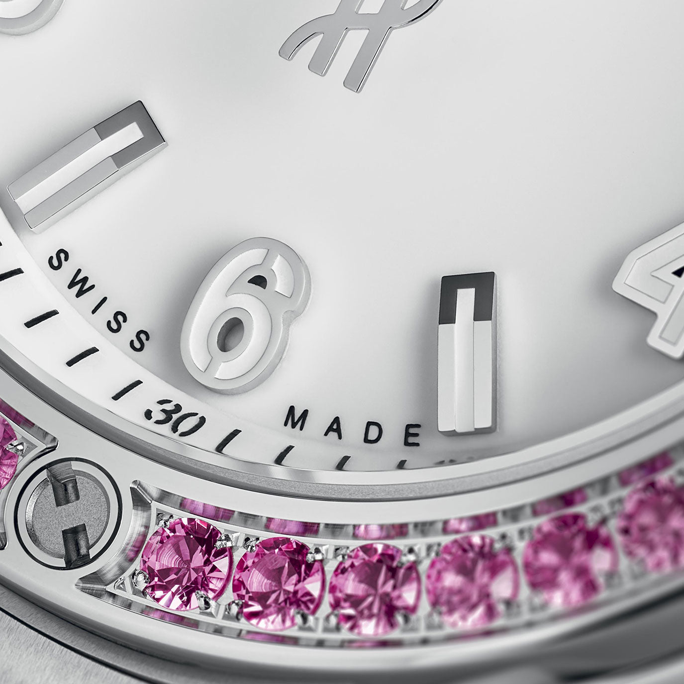 – Bezel: Polished Stainless Steel Set with 36 Pink Sapphire