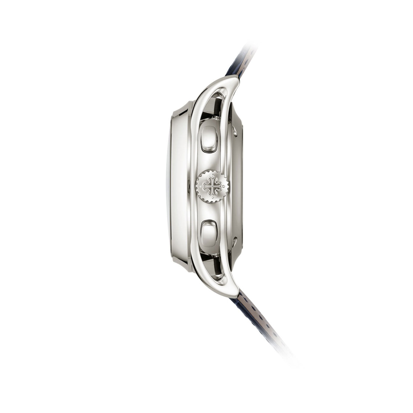 The Patek Philippe Grand Complications Ref. 5308G-001 is a remarkable showcase of the brand’s horological mastery, combining three of the most prestigious complications: minute repeater, split-seconds chronograph, and perpetual calendar. Encased in elegant 18k white gold, this timepiece features a sunburst blue dial with blue-gradient edges, white gold applied hour markers, and refined displays for day, date, month, leap year, and moon phases. At its heart lies the hand-wound Caliber R CHR 27 PS QI, developed with two patented innovations ensuring optimal energy efficiency. This extraordinary piece blends mechanical sophistication, modern aesthetics, and Patek Philippe’s timeless artistry.