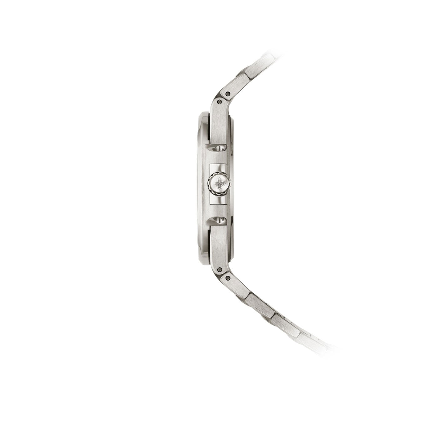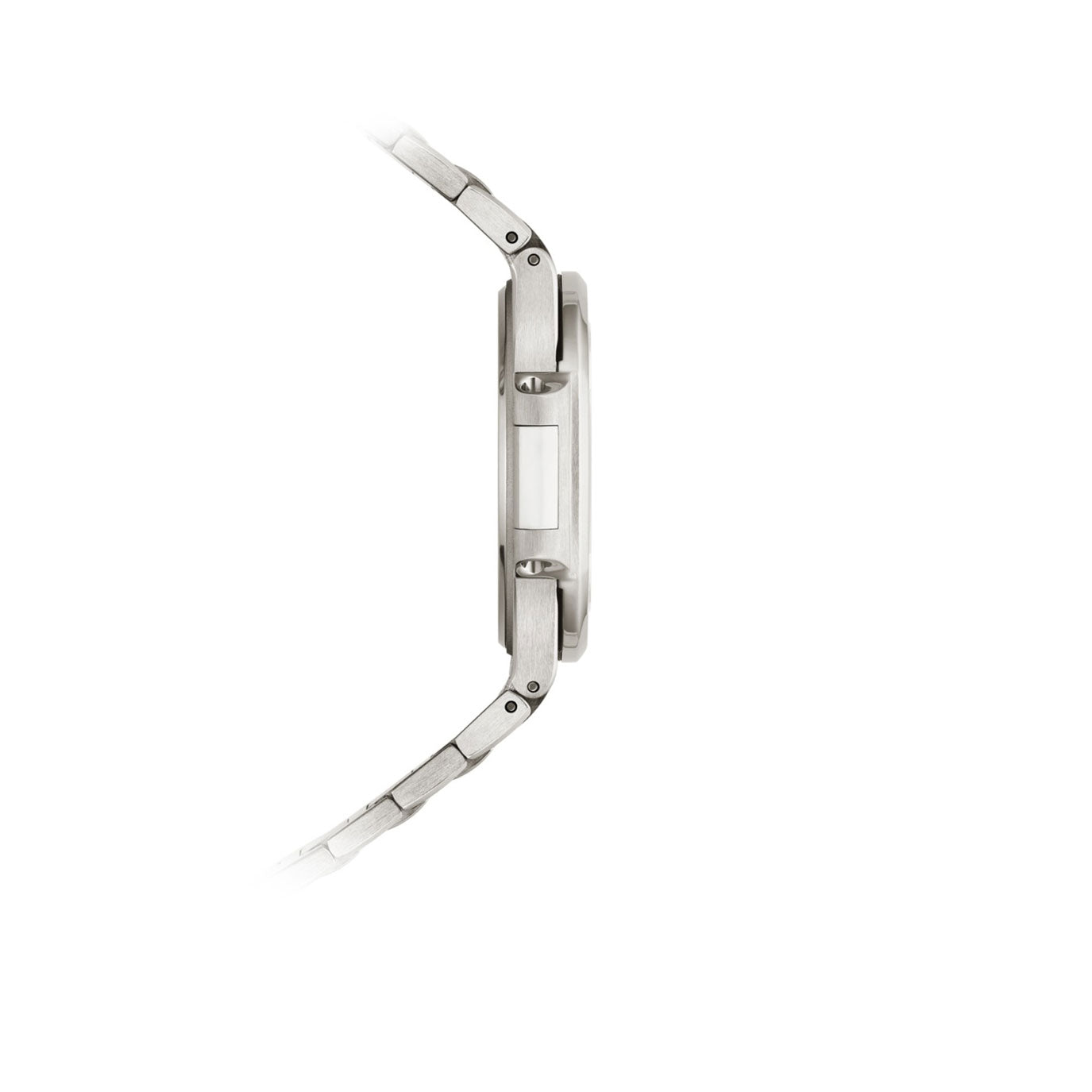 The Patek Philippe Nautilus in white gold is a luxurious expression of modern sport-chic elegance. This refined 32 mm model features a lacquered azure blue dial with a signature “wave” pattern, enhanced by white gold applied numerals and hour markers filled with luminescent coating for readability. The polished bezel is set with 46 brilliant-cut diamonds (~0.8 ct), adding a sophisticated sparkle. Equipped with the highly reliable Caliber E 23‑250 S C quartz movement, it ensures precision with date and central seconds functions. The full white gold bracelet includes a patented fold-over clasp and lockable adjustment system, combining beauty with everyday practicality. A stunning piece for those who appreciate timeless elegance with a contemporary edge.