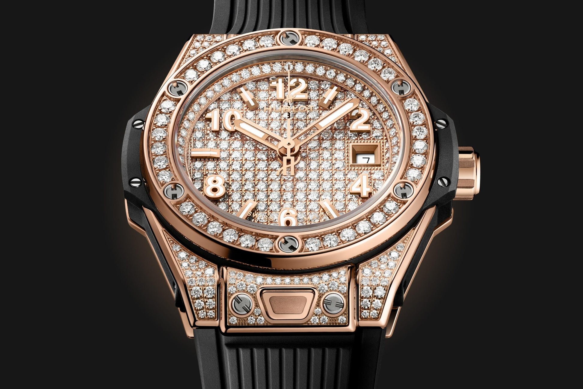 Unworn Hublot Big Bang ONE CLICK KING GOLD FULL PAVÉ 485.OX.9000.RX.1604. 33 mm, Set with 232 Diamonds dial, Polished 18K King Gold Set with 130 Diamonds for 0.4ct case, Sapphire with Anti-reflective Treatment crystal, Polished 18K King Gold Set with 36 Diamonds for 0.76ct bezel, HUB1120 calibre, Self-winding Movement, 40hours power reserve, Black Structured Lined Rubber Straps with 18K King Gold and Black-plated Titanium Deployant Buckle Clasp. Water resistant to 100 m.