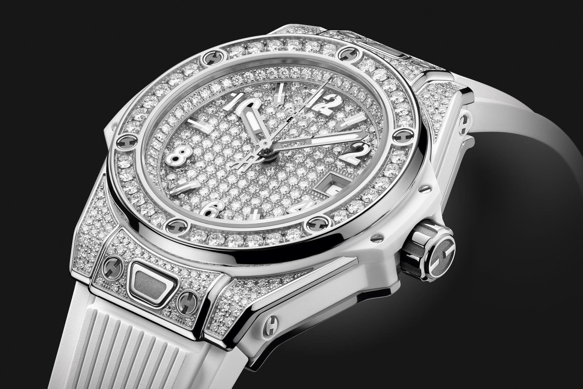 Unworn Hublot Big Bang ONE CLICK STEEL WHITE FULL PAVÉ 485.SE.9000.RW.1604. 33 mm, Set with 232 Diamonds dial, Polished Stainless Steel Set with 130 Diamonds for 0.4ct case, Sapphire with Anti-reflective Treatment crystal, Polished Stainless Steel Set with 36 Diamonds for 0.76ct bezel, HUB1120 calibre, Self-winding Movement, 40hours power reserve, White Structured Lined Rubber Straps with Stainless Steel Deployant Buckle Clasp. Water resistant to 100 m.