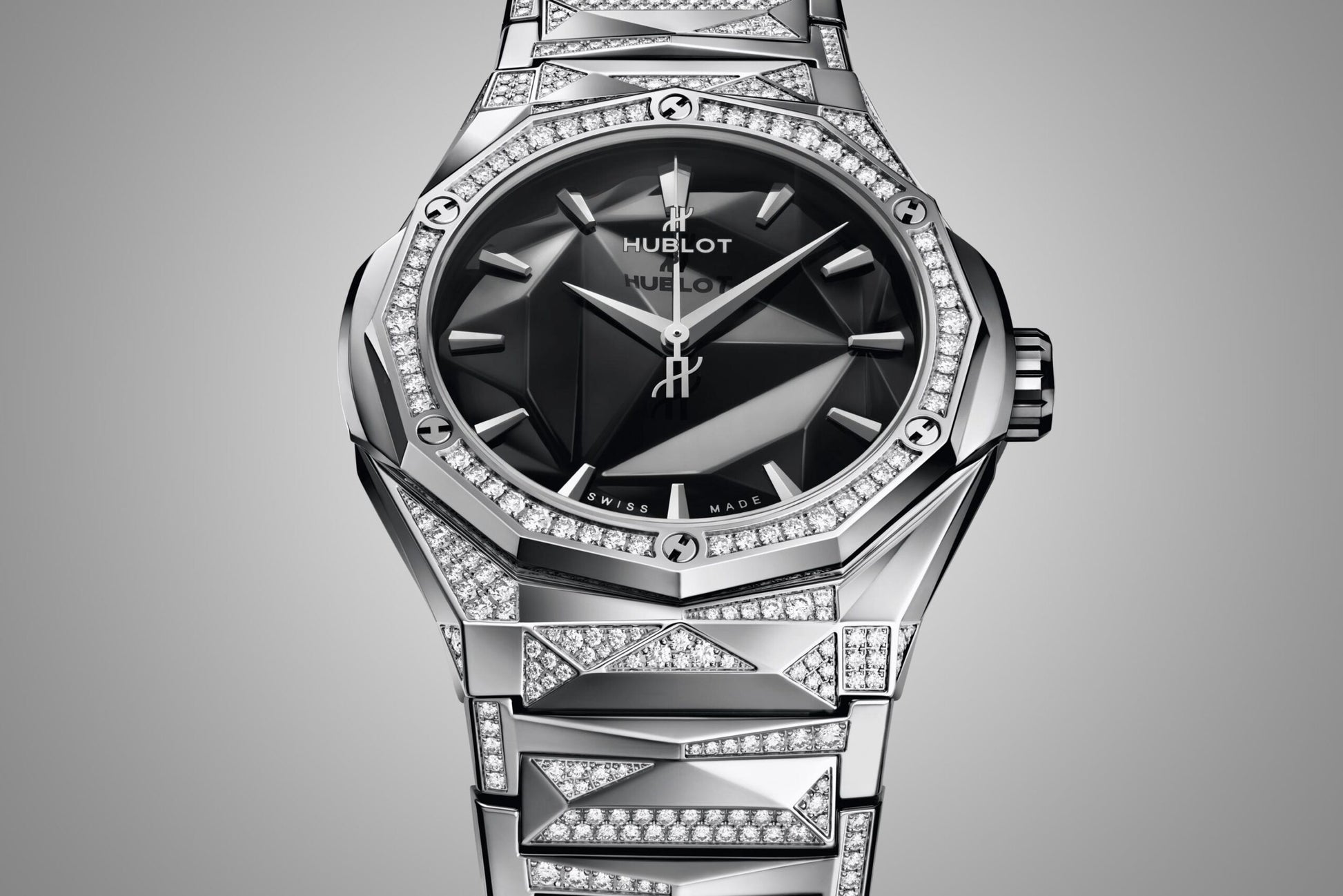 Unworn Hublot Classic Fusion ORLINSKI BRACELET TITANIUM ALTERNATIVE PAVÉ 550.NS.1800.NS.3804.ORL22. 40 mm, Polished Faceted Black dial, Polished Titanium Set with 112 Diamonds totaling ~0.5ct case, Sapphire with Anti-reflective Treatment crystal, Polished Titanium Set with 54 Diamonds totaling ~0.6ct 6 H-shaped Titanium Screws bezel, HUB1100 calibre, Self-winding Movement, 42 Hours power reserve, Polished Titanium Bracelet set with 486 Diamonds with Titanium Deployant Buckle Clasp. Water resistant to 50 m.