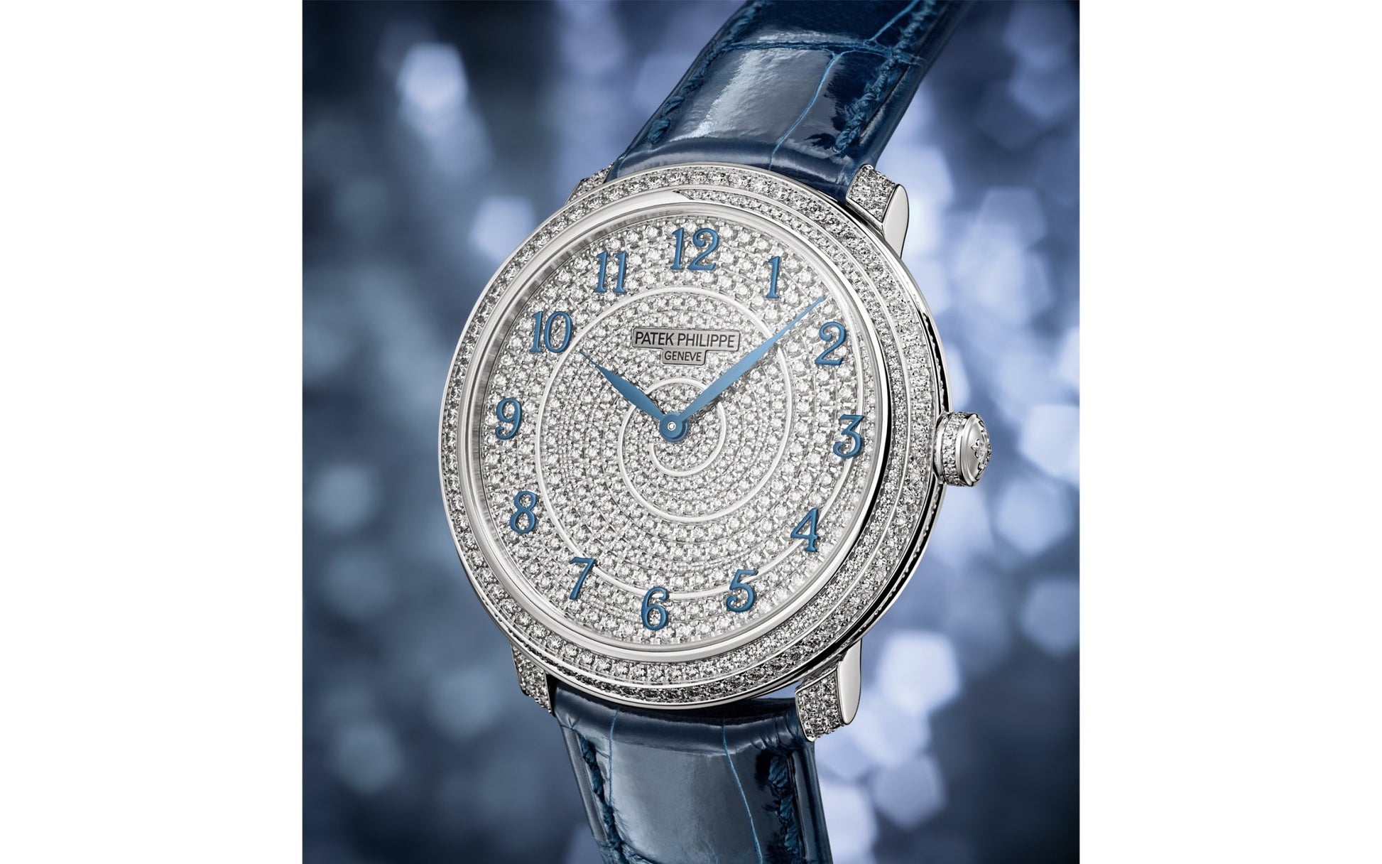 Luxury Ladies Watch Patek Philippe Calatrava Diamond Ribbon Joaillerie, 18kt White Gold, 36,5mm, Reference 4978/400G-001 - Sleek lines and sophisticated elegance combined with meticulous craftsmanship make this timepiece timeless sophistication. The Diamond Ribbon Joaillerie features a very elegant case fully encrusted with diamonds. The beauty of the watch is that Patek Philippe decorates with diamonds even the slanted edge that connects the bezel to the case back. The dial is adorned with a diamond swirl, reminiscent of the spinning ribbons of gymnasts, framed in white gold, which gives the watch a playful touch. To complete the breathtaking design, Patek Philippe opted for blued 18k White Gold leaf-shaped hands, and applied large blued 18k White Gold Arabic numeral hour markers. For the case and dial, 679 graduated diamonds were used, forming a spiral: ~3.99 carats and for the lugs 48 diamonds: ~0.17 ct. A polished 18kt White Gold Screw-down crown with 16 diamonds: ~0.03 ct. and the Patek Philippe logo is located on the right side of the case. The dial closed by a Scratch-resistant Sapphire Crystal. Sapphire-crystal too case back, which allows of the case, allows you to see the magical work of the movement. The watch features fixed bezel from an 18kt White Gold set with diamonds. This model has caliber Patek Philippe Caliber 240, an Ultra-thin self-winding mechanical movement containing 27 Jewels, with a power reserve of 48 hours. She is presented is on shiny dusk blue Alligator/Crocodile leather strap with square scales, hand-stitched and a striking 18kt White Gold prong buckle with 27 diamonds: ~0.21 ct. The water resistance is up to 30m/100ft (3 ATM).