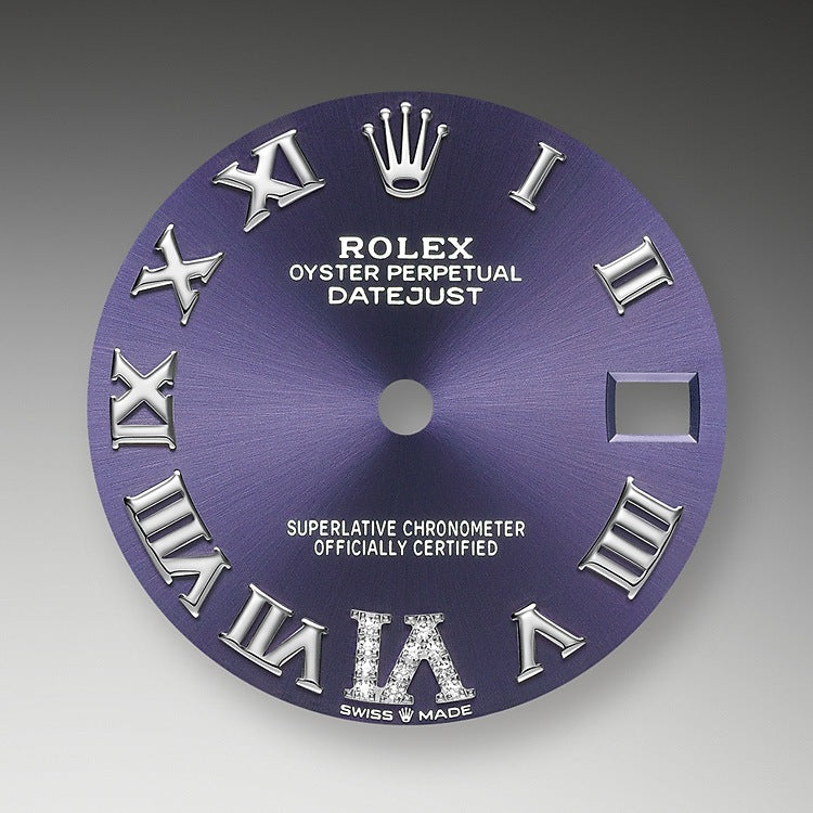 - Dial color: Aubergine dial with a applied polished 18k White Gold Roman numerals as hour markers and 11 diamonds on large numeral VI