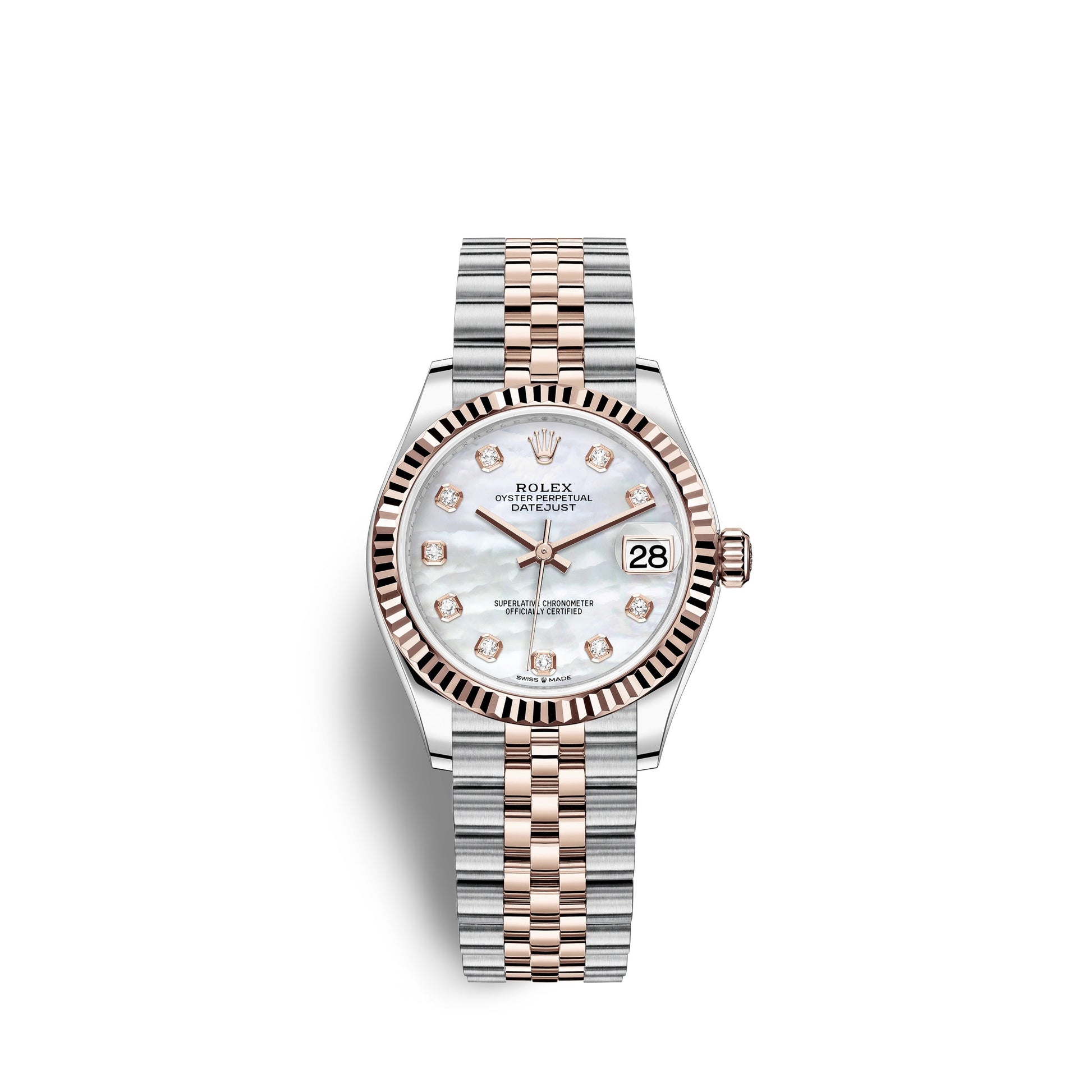 - Dial color: White mother-of-pearl dial with 10 Diamonds as hour markers framed in 18k Rose Gold
