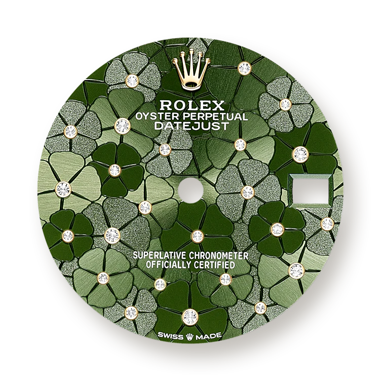 - Dial color: Olive green dial with floral motif and 24 Diamonds in 18k Yellow Gold settings