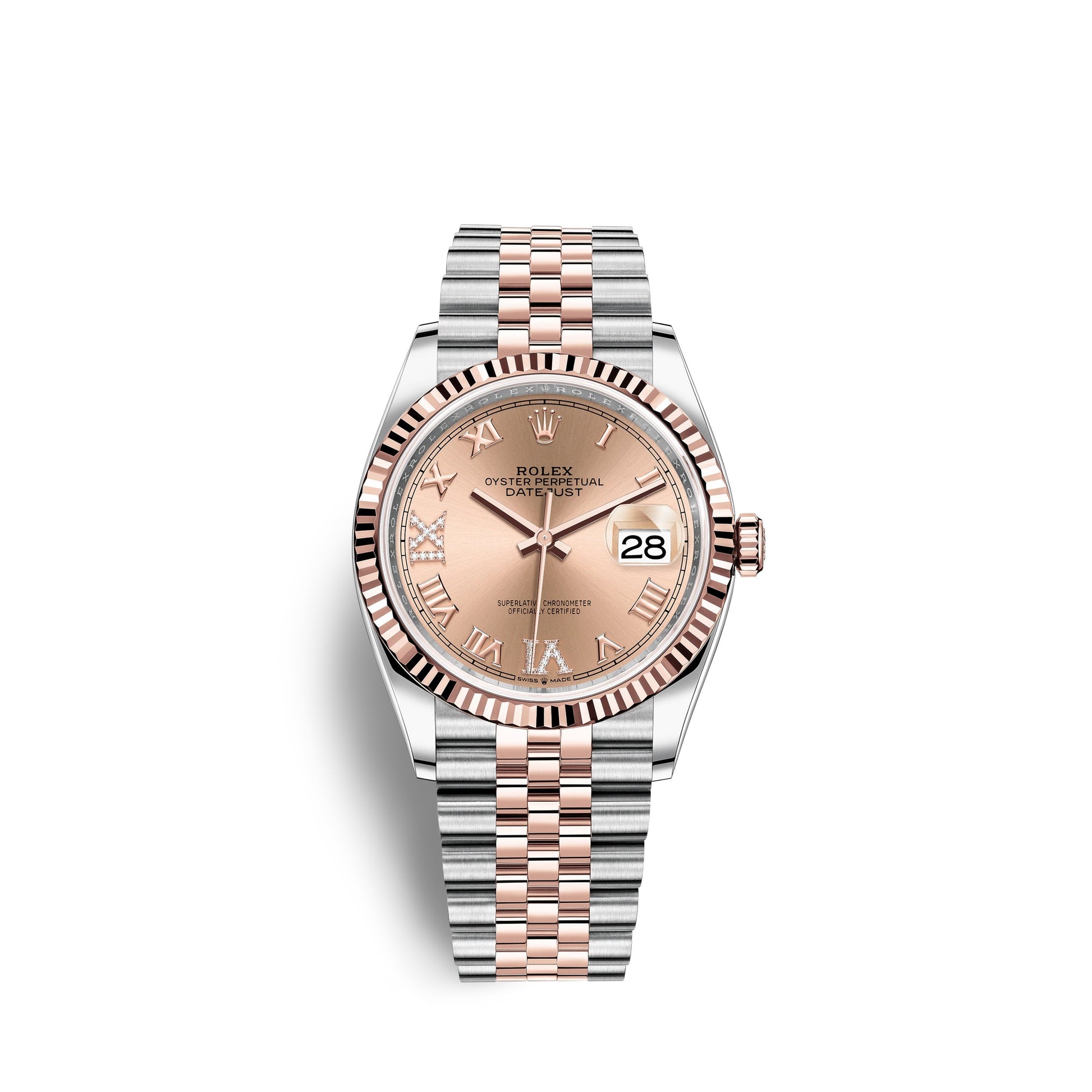 Rolex Datejust 36 watch with polished 18k Everose Gold and Stainless Steel case, Reference 126231-0027. This model has Rosé-colour dial with a fine sunray finish. The dial is adorned applied polished 18k Everose Gold Roman numeral hour markers also VI and IX in 18k Everose gold, set with 24 diamonds and polished 18k Everose Gold hands. Fine printed minute track on teh dial perimeter. Date window with a "Cyclops" magnifying lens displayed at the 3 o'clock position. Polished 18k Everose Gold "Twinlock" crown, featuring two sealed zones when the crown is screwed down: the first inside the tube of the crown, the second inside the winding crown itself. The dial closed by a Scratch-resistant Sapphire Crystal and solid case back made. The watch is equipped fluted fixed polished 18k Everose Gold bezel. The watch is mechanical self-winding Manufacture Rolex 3235 contains 31 Jewels and has an approximate power reserve of 70 hours of power reserve. This model presented on Jubilee bracelet of brushed Stainless Steel outer links and polished 18k Everose Gold center links with a Folding Oysterlock safety clasp with Easylink 5 mm comfort extension link. The water resistance is up to 100m/330ft (10 ATM). The watch is Superlative Chronometer certified: the movement is COSC certified prior to casing, then it is tested a second time by Rolex after being cased to ensure accuracy.