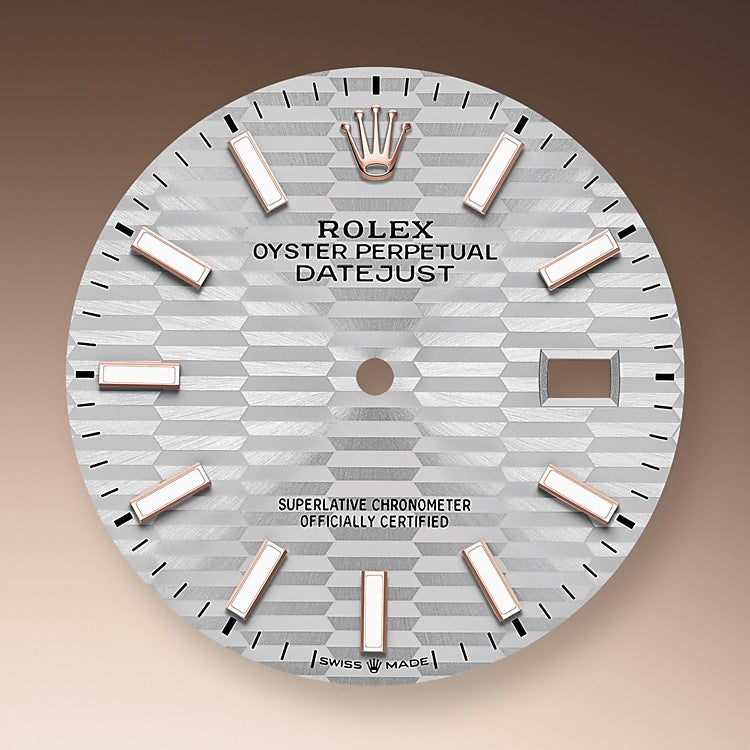 Rolex Datejust 36 watch with polished 18k Everose Gold and Stainless Steel case, Reference 126231-0033. This model has Silver dial with fluted motif and highly legible Chromalight display with long-lasting blue luminescence. The dial is adorned Rolex Crown logo of 18k Everose Gold at the 12 o'clock position, applied index hour markers of 18k Everose Gold settings with luminescent fill and polished 18k Everose Gold hands with luminescent fill. Date window with a "Cyclops" magnifying lens displayed at the 3 o'clock position. Polished 18k Everose Gold "Twinlock" crown, featuring two sealed zones when the crown is screwed down: the first inside the tube of the crown, the second inside the winding crown itself. The dial closed by a Scratch-resistant Sapphire Crystal and solid case back made. The watch is equipped fluted fixed polished 18k Everose Gold bezel. The watch is mechanical self-winding Manufacture Rolex 3235 contains 31 Jewels and has an approximate power reserve of 70 hours of power reserve. This model presented on Jubilee bracelet of brushed Stainless Steel outer links and polished 18k Everose Gold center links with a Folding Oysterlock safety clasp with Easylink 5 mm comfort extension link. The water resistance is up to 100m/330ft (10 ATM).