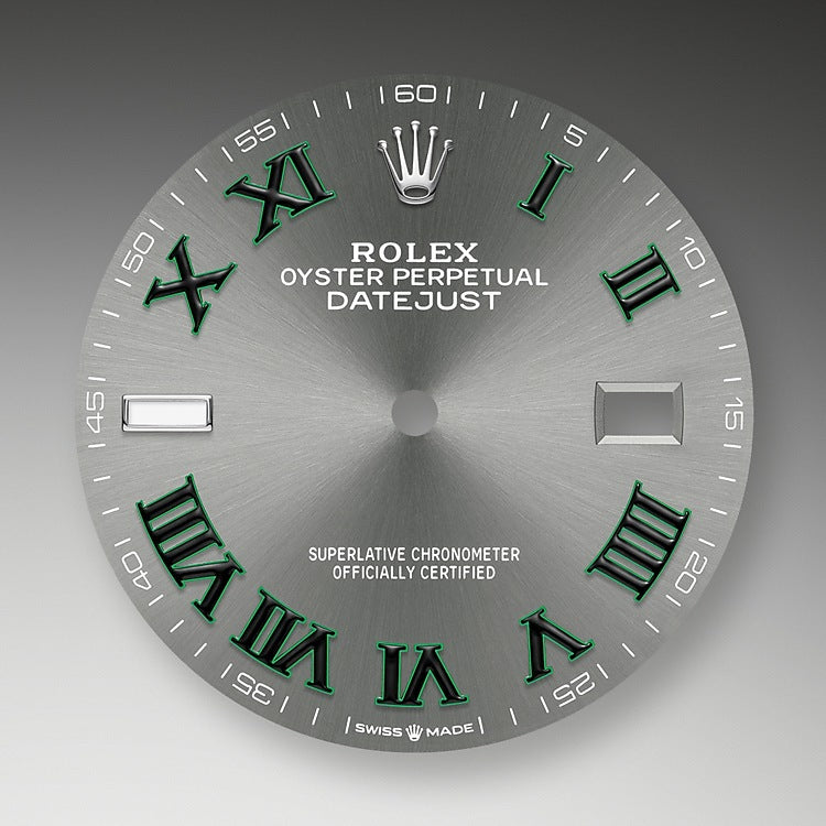 Rolex Datejust 36 watch with polished Stainless Steel and 18k White Gold case, Reference 126234-0045. This model has Slate dial with a fine sunray finish and highly legible Chromalight display with long-lasting blue luminescence. The dial is adorned Rolex Crown logo of 18k White Gold at the 12 o'clock position polished 18k White Gold hands - hour and minute hands with partial luminous fill, and applied polished Green colored Roman numerals hour markers. Fine printed minute track on teh dial perimeter with Arabic numerals marking every 5-minute interval. Date window with a "Cyclops" magnifying lens displayed at the 3 o'clock position. The dial closed by a Scratch-resistant Sapphire Crystal and solid case back made. The watch is equipped fluted fixed polished 18k White Gold bezel and polished Stainless Steel "Twinlock" crown with double waterproofness system. The watch is mechanical self-winding Manufacture Rolex 3235 contains 31 Jewels and has an approximate power reserve of 70 hours of power reserve. This model presented on Jubilee bracelet of brushed outer and polished center links Stainless Steel with a Folding Oysterlock safety clasp with Easylink 5 mm comfort extension link. The water resistance is up to 100m/330ft (10 ATM).