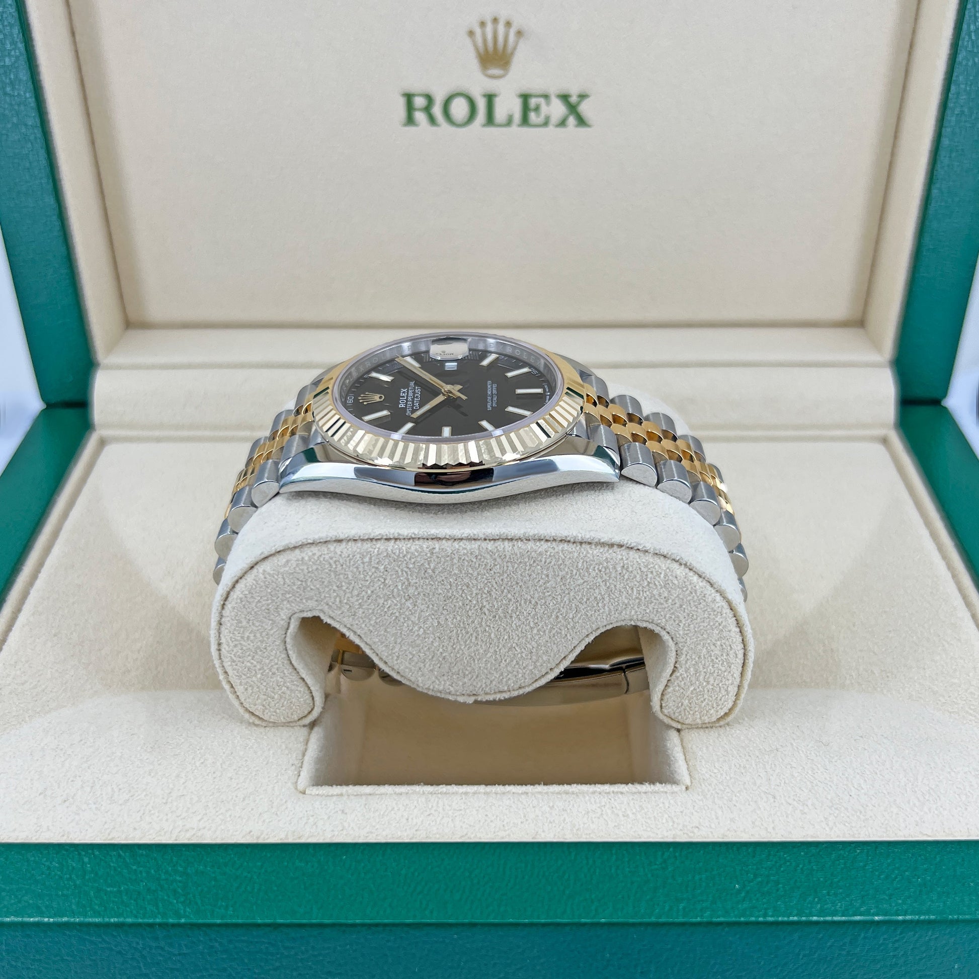 Rolex Datejust 41 watch with polished 18k Yellow Gold and Stainless Steel case, Reference 126333-0014. This model has Bright black dial with a fine sunray. The dial is adorned polished 18k Yellow Gold hands and applied polished 18k Yellow Gold index hour markers with luminescent fill. Fine printed minute track on teh dial perimeter with Arabic numerals marking every 5-minute interval. Date window with a "Cyclops" magnifying lens displayed at the 3 o'clock position. Polished 18k Yellow Gold "Twinlock" crown, featuring two sealed zones when the crown is screwed down: the first inside the tube of the crown, the second inside the winding crown itself. The dial closed by a Scratch-resistant Sapphire Crystal and solid case back made. The watch is equipped Fluted fixed polished 18k Yellow Gold bezel. The watch is mechanical self-winding Manufacture Rolex 3235 contains 31 Jewels and has an approximate power reserve of 70 hours of power reserve. This model presented on Jubilee bracelet of brushed Stainless Steel outer links and polished 18k Yellow Gold center links with a Folding Oysterlock safety clasp with Easylink 5 mm comfort extension link. The water resistance is up to 100m/330ft (10 ATM).