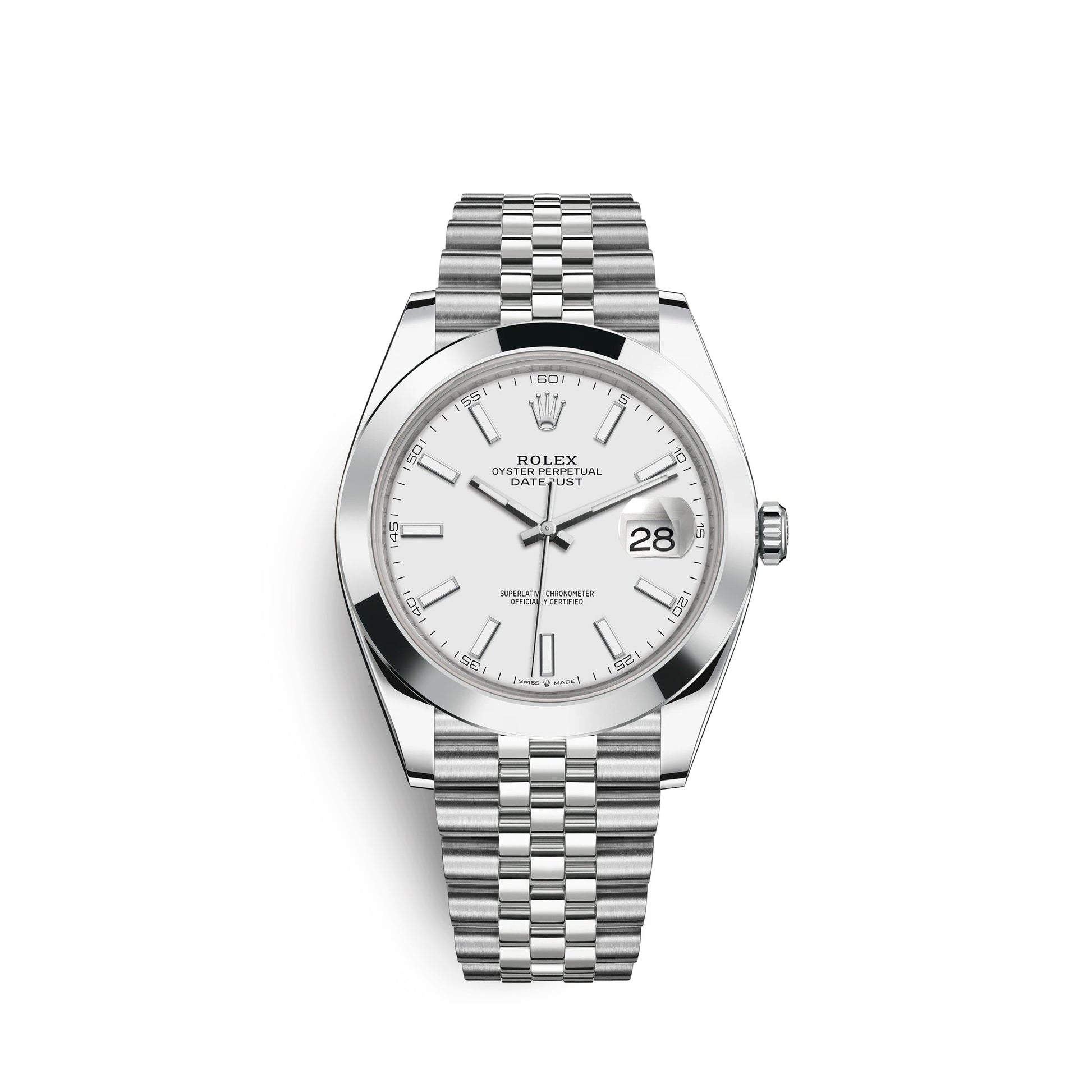 Rolex Datejust 41 watch with polished Stainless Steel case, Reference 126300-0006. This model has White dial with highly legible Chromalight display with long-lasting blue luminescence. The dial is adorned with polished hands - hour and minute hands with partial luminous fill and applied polished index hour markers with luminescent fill. Fine printed minute track on teh dial perimeter with Arabic numerals marking every 5-minute interval. Date window with a "Cyclops" magnifying lens displayed at the 3 o'clock position. Polished Stainless Steel "Twinlock" crown, featuring two sealed zones when the crown is screwed down: the first inside the tube of the crown, the second inside the winding crown itself. The dial closed by a Scratch-resistant Sapphire Crystal and solid case back made. The watch is equipped Smooth fixed polished Stainless Steel bezel. The watch is mechanical self-winding Manufacture Rolex 3235 contains 31 Jewels and has an approximate power reserve of 70 hours of power reserve. This model presented on Stainless Steel Jubilee bracelet of brushed outer links and polished center links with a Folding Oysterlock safety clasp with Easylink 5 mm comfort extension link. The water resistance is up to 100m/330ft (10 ATM).