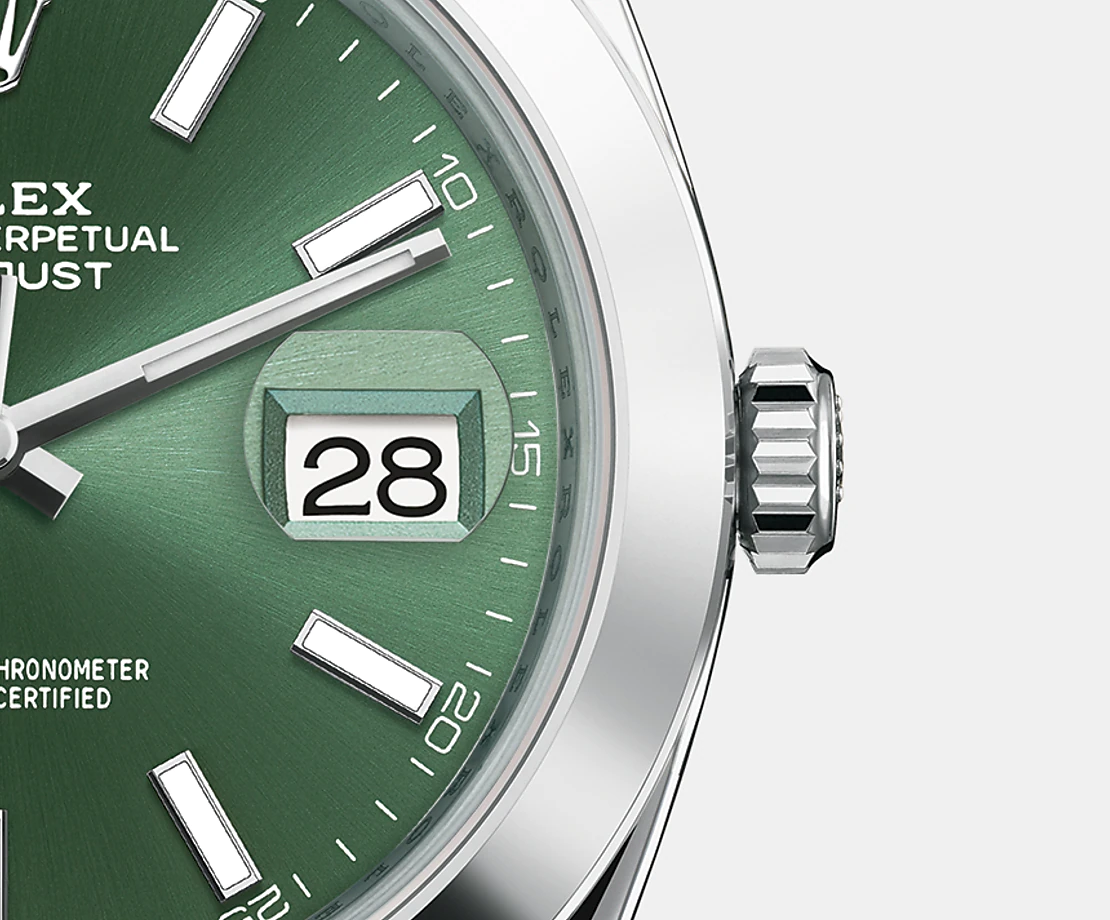 - Crystal: Scratch-resistant sapphire, Cyclops lens over the date