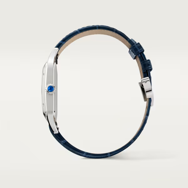 Elevating a legendary silhouette with refined brilliance, the Cartier Santos Dumont de Cartier Ref# WSSA0022, Large Watch brings together timeless design and modern innovation. Exquisitely detailed and versatile, this timepiece is perfect for those who appreciate understated luxury and everyday elegance. The 43.5mm x 31.4mm square case, crafted from Stainless Steel with polished beveled edges, delivers a bold yet balanced presence on the wrist. The standout feature is the Stainless Steel bezel, securely fastened with Cartier’s signature exposed screws. The polished beaded Stainless Steel crown, set with a faceted synthetic spinel cabochon, completes the design with an iconic flourish. The silvered satin-brushed dial with sunray effect is graced with bold black Roman numeral hour markers, a fine minute/seconds track along the perimeter, reminiscent of railway tracks and blued steel sword-shaped hands, offering striking legibility against the light-toned background. At its heart, the watch houses Cartier’s in-house quartz movement, this watch ensures effortless, maintenance-free performance for daily wear. Scratch-resistant sapphire crystal and a robust case back protect the dial and movement, ensuring long-lasting, accurate performance. A Navy Blue alligator leather strap adds warmth and texture, paired with a classic Stainless Steel Tang buckle for a secure, comfortable fit. The unworn Cartier Dumont de Cartier WSSA0022 with water resistant to 30 meters (100 feet) is the epitome of quiet luxury, effortlessly bridging the gap between daywear elegance and evening refinement.