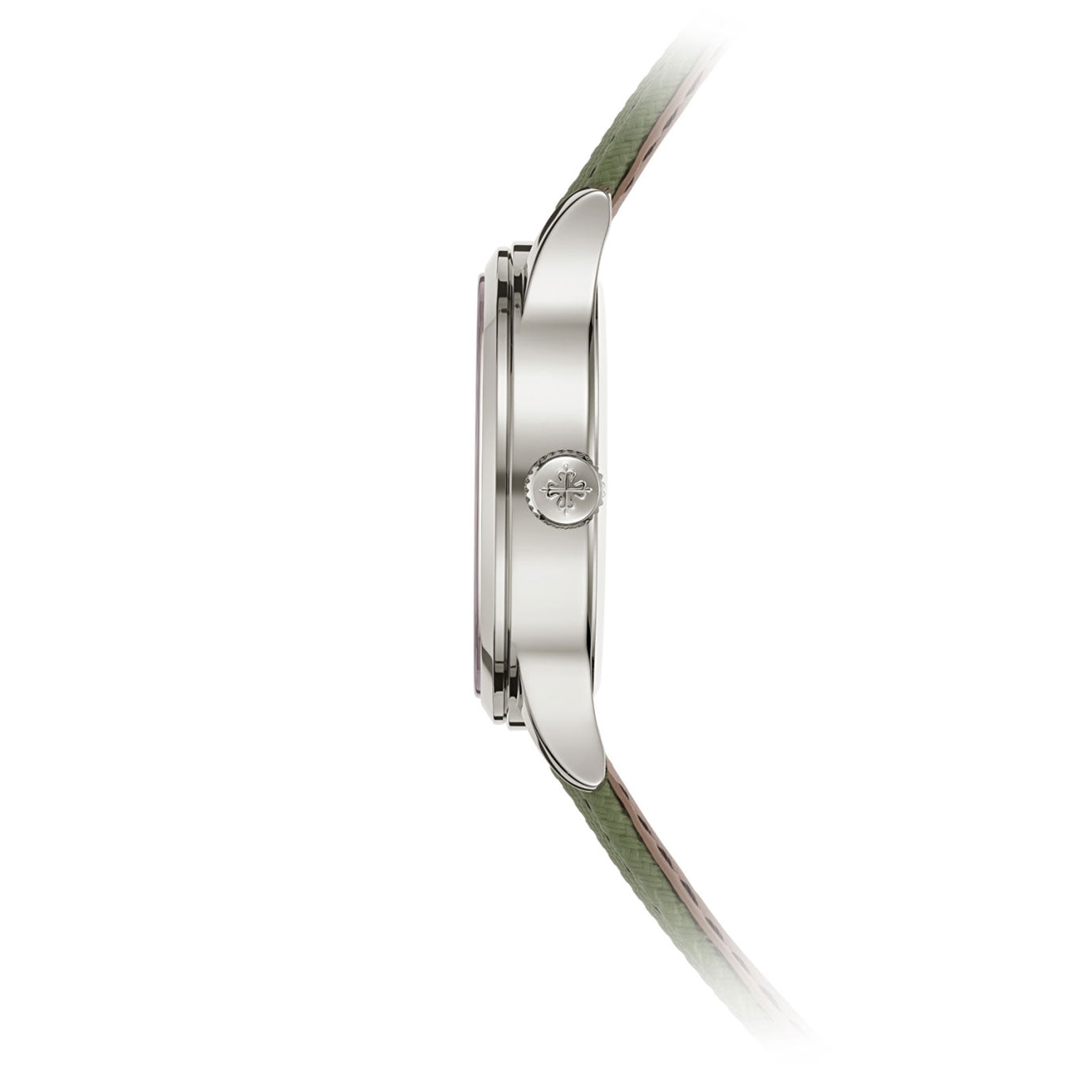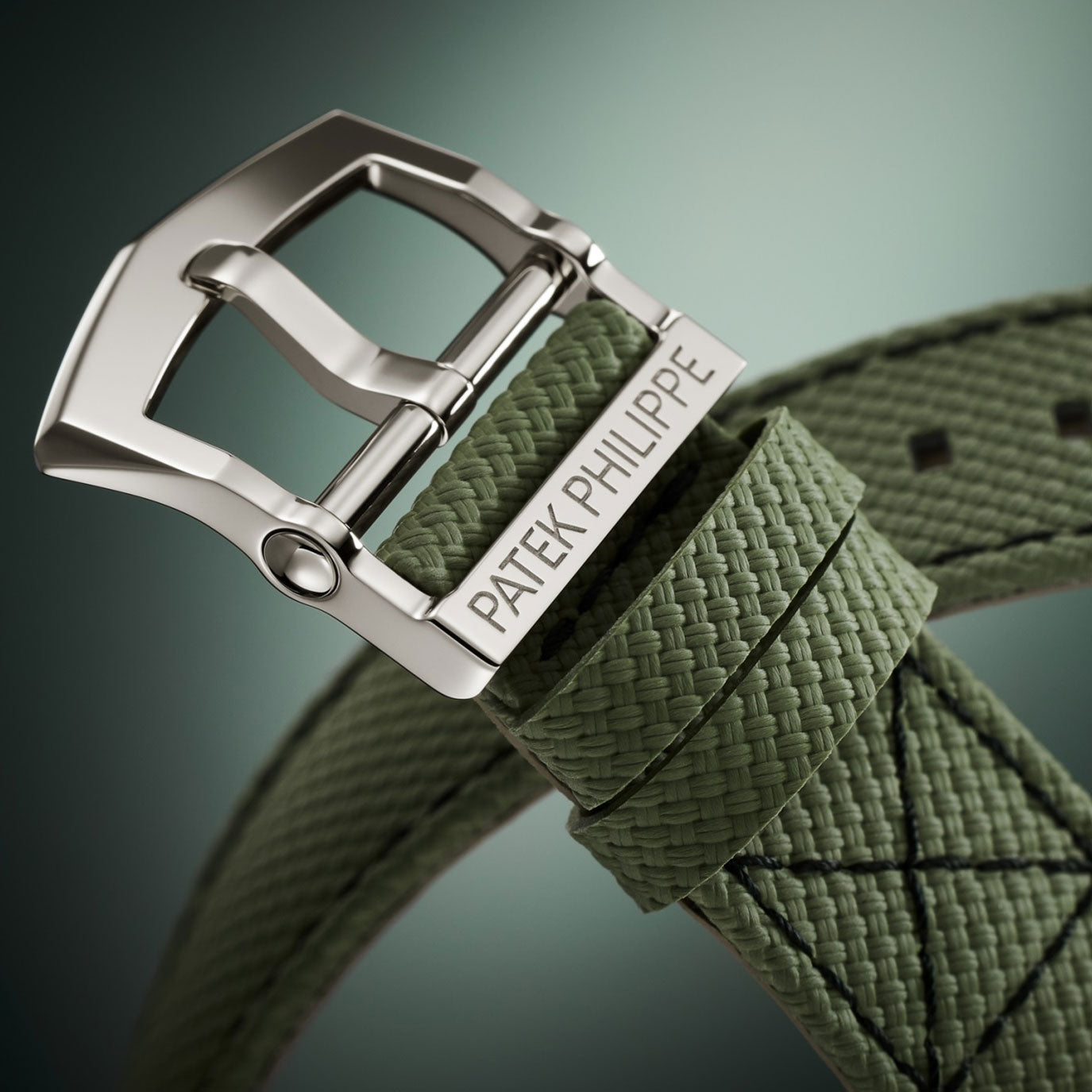 Patek Philippe reimagines the iconic Calatrava Pilot Travel Time with a refined yet rugged aesthetic in the 5524G-010. Crafted in 18k white gold, this bold travel watch features an ivory lacquered dial with applied blackened white gold numerals, filled with luminescent coating for high readability. At its core is the self-winding Caliber 26‑330 S C FUS, offering dual time zone functionality, day/night indicators, and a date hand synchronized with local time. The patented pusher safety system prevents accidental adjustments during travel. Completed by a khaki green strap in durable composite material with fabric pattern and a white gold clevis-style buckle, this timepiece seamlessly merges utility, elegance, and innovation.