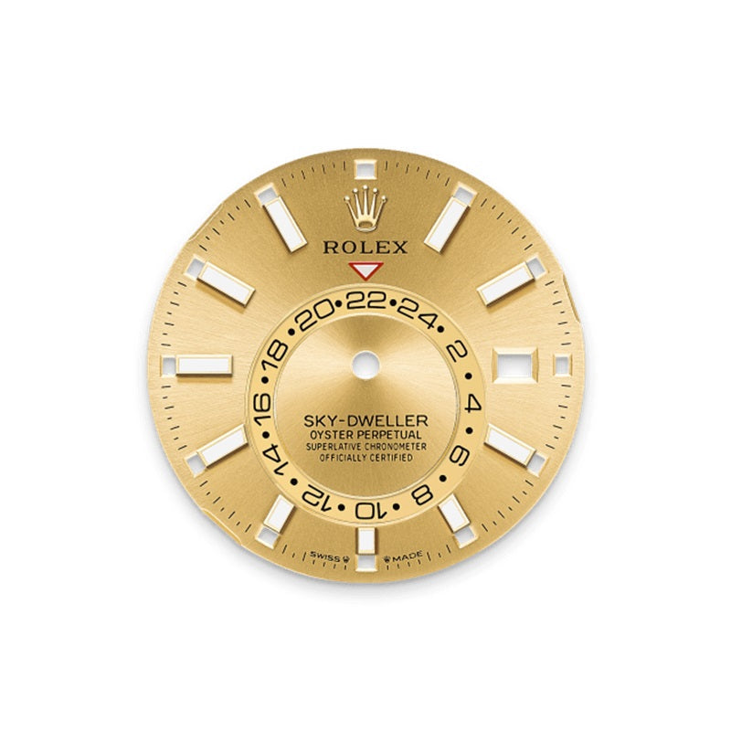 Introducing the Rolex Sky-Dweller, an epitome of elegance and innovation in horology. This stunning timepiece features a 42mm 18K yellow gold case, beautifully complemented by a bright Champagne dial. The dial is adorned with Chromalight display for enhanced legibility and an off-center disc for dual time zone functionality. The iconic fluted bezel adds a classic touch, while the scratch-resistant sapphire crystal ensures durability. Powered by the Rolex Caliber 9002, this watch boasts a remarkable 72-hour power reserve and is water-resistant up to 100 meters. The 18K yellow gold Jubilee bracelet with an Oysterclasp and Easylink comfort extension link guarantees a secure and comfortable fit. Offered in unworn condition, this Sky-Dweller comes as a full set with the original Rolex box, booklets, and a Rolex warranty card dated 2024. Secure this exceptional timepiece today and experience the blend of cutting-edge technology and timeless elegance. Perfect for any collection, the Rolex Sky-Dweller is ready to accompany you on any journey, whether for business or leisure.